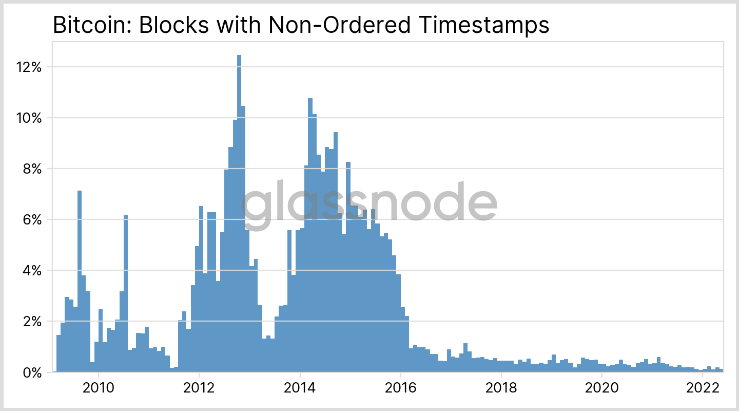 Counterintuitively, we also observe some negative time intervals for BTC: Usually we can assume that the clocks used by the different miners are synced, thanks to standards like the Network Time Protocol. This means that the timestamps of subsequent blocks are in order and always increasing. In fact, this is a strict requirement for Ethereum, as defined in its Yellow Paper. For Bitcoin, though, the conditions are more relaxed and no monotonic timestamp sequences are enforced. In the last few years, though, out-of-order timestamps became scarce (see Fig. 3).