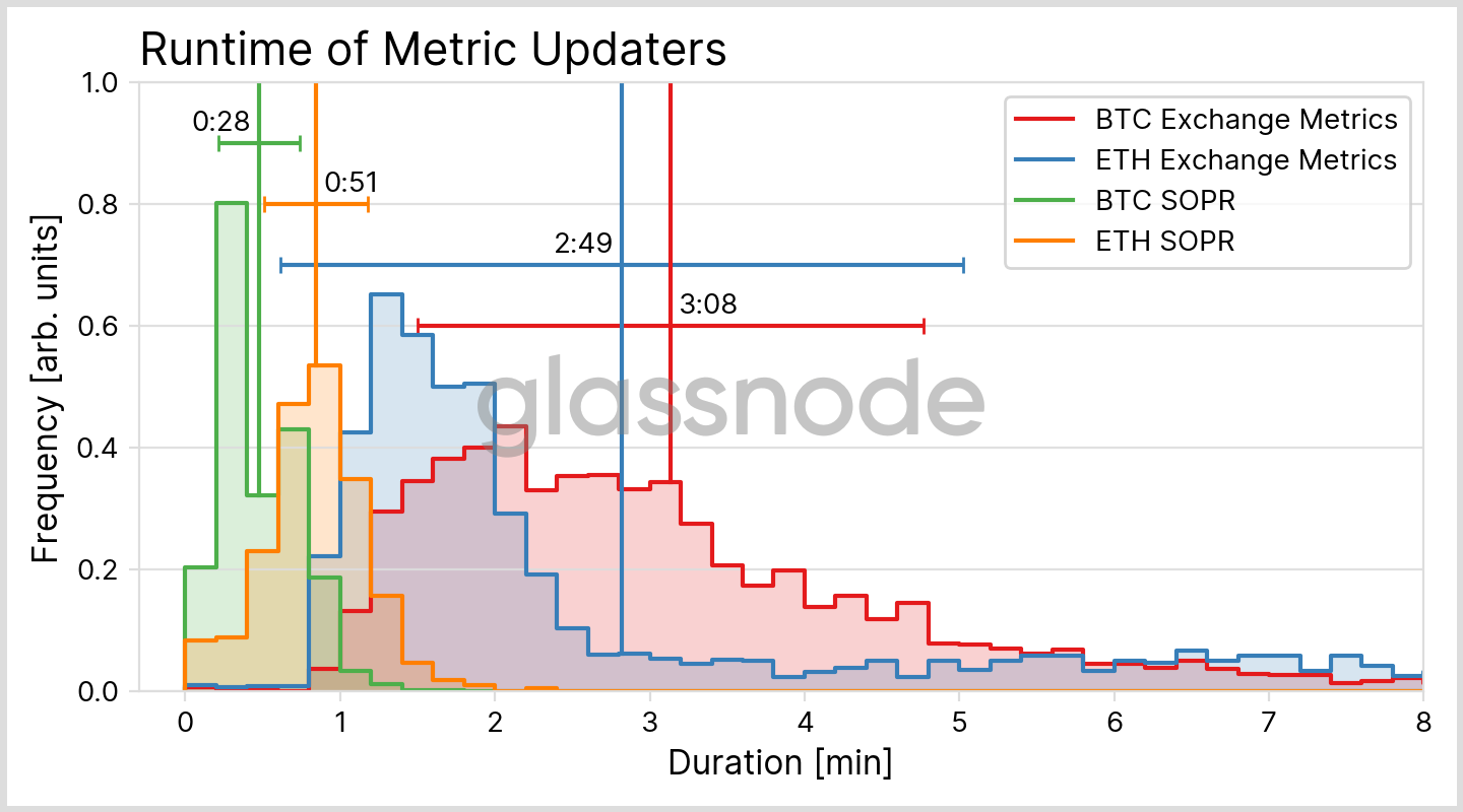 It is now time for the last step of the block’s journey towards its inclusion in a metric: One of our programs analyzes the updated dataset, performs some computations and appends new data points to our metric. These updaters are currently scheduled to run in intervals that depend on the metric resolution. For example, our updaters run at 00:00:00 UTC for our metrics with 1 day resolution, and every full ten minutes for 10 minute resolution metrics (for details see our documentation here). Thus, even for the latter, we have to wait an additional zero to ten minutes, on average five minutes, until the block’s data gets picked up. The actual runtime of the updater strongly depends on the metric complexity and can be between a few seconds up to several minutes, with examples given in Fig. 4 below.