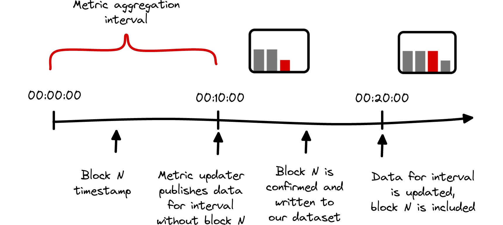 - Data availability: How exactly does the data contained in the blockchain propagate into our metrics and how long does this take? When can a data point be considered “complete”?