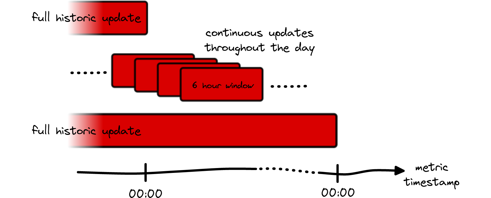 - Rolling updates: In case of our metrics with 1h or 10min resolution we recompute the values for the last 6 hours in each update to the metric. For example, if our updater runs at 10:00:00, it will not only append a new data point to the metric, but apply the full clustering knowledge to all timestamps between 04:00:00 and 10:00:00. This ensures that new clustering data enters the metrics as fast as possible, without having to wait for the daily full historic update.