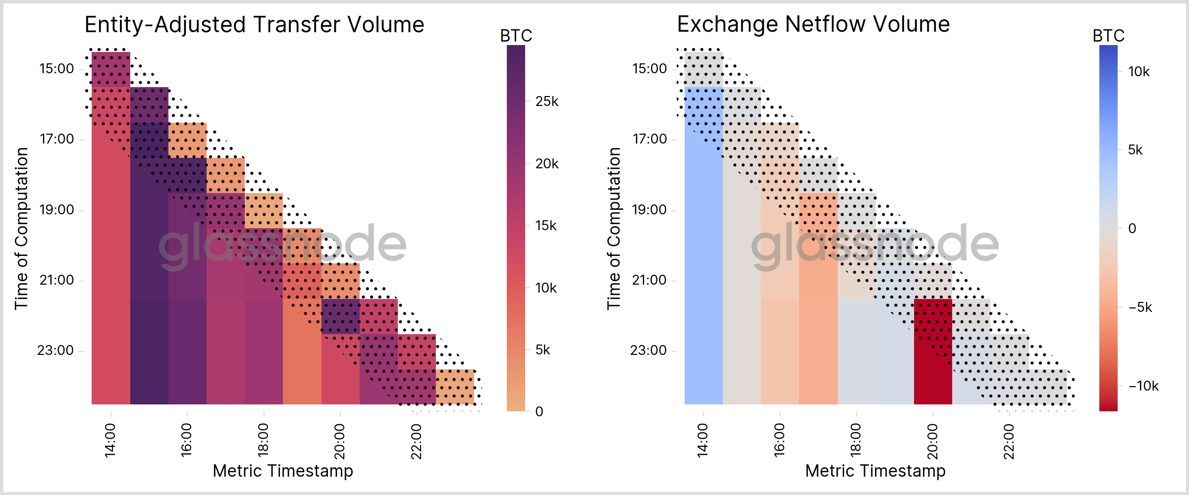 To gauge if our understanding as described above is comprehensive, let us look at some real-world data. To this end, we chose the number of Addresses Depositing to Exchanges as a representative metric for both BTC and ETH, evaluated our log files and extracted all required timestamps.