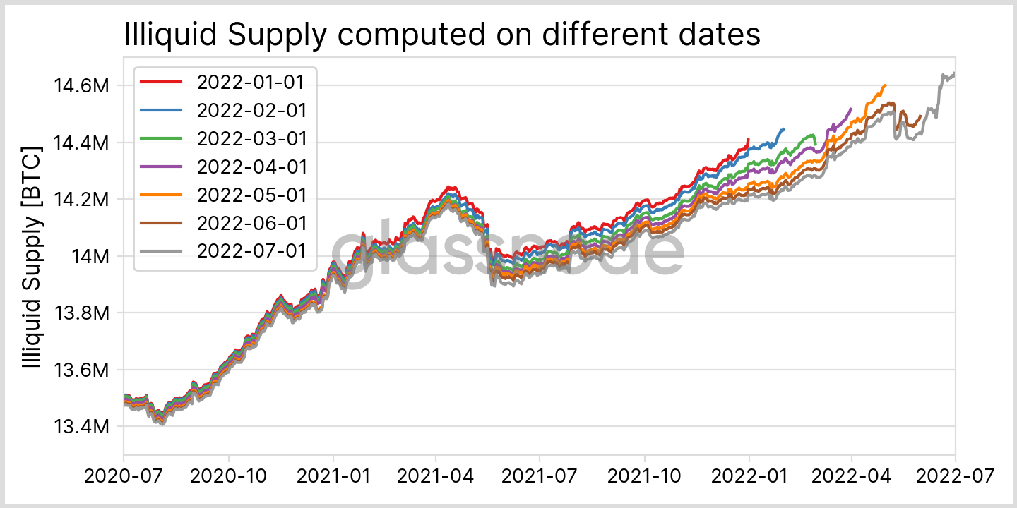 To illustrate the problem of metric convergence we chose the metric Illiquid Supply as an example. It is computed by summing up the balances of all entities that are below a certain liquidity threshold. For more details on the metric and its interpretation see our previous article here. In terms of address clustering we face the following problem: Let’s assume we detect a new address on the blockchain, which does not spend any of its coins for a long time. Therefore, our heuristics can often not assign the address to an existing cluster – a cluster which may actually be highly liquid – and therefore oppose the metric’s meaning. Until coins are moved, the address’ balance will contribute to the illiquid supply and hence we overestimate the value for the metric.