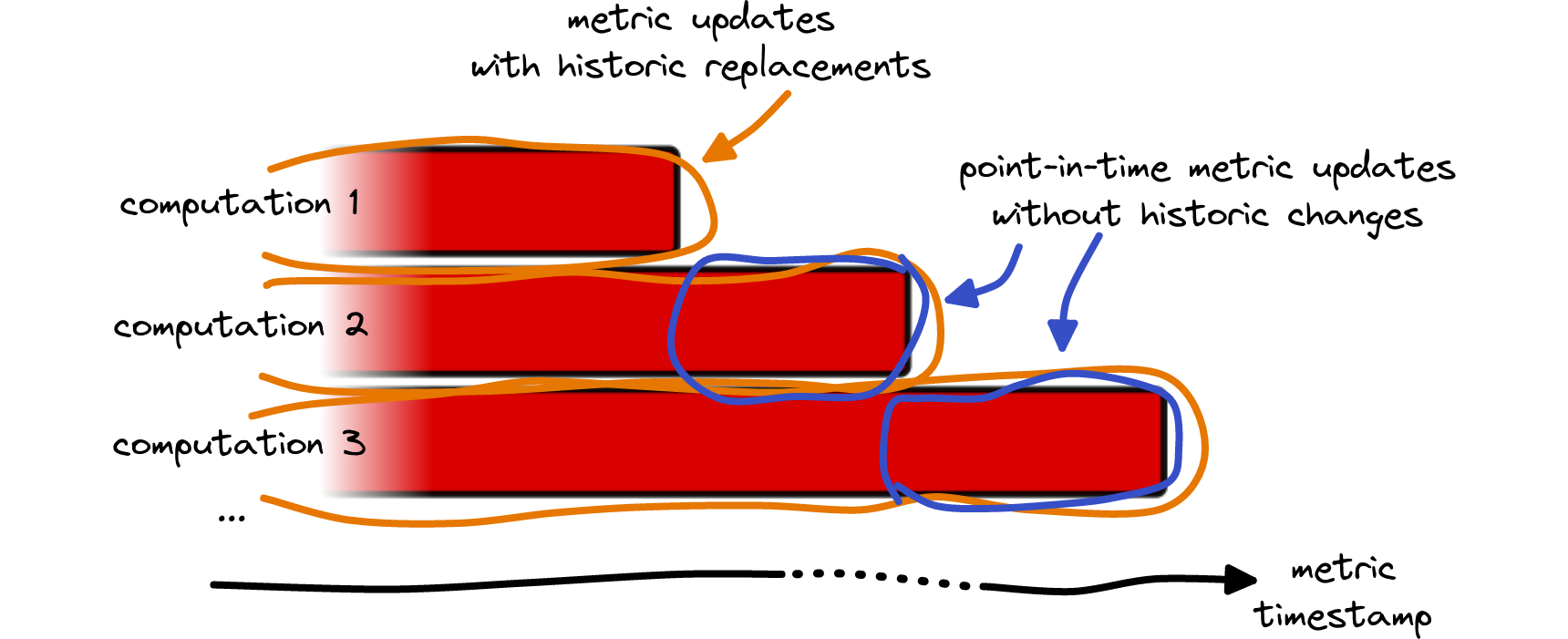 In order for our metrics to reflect the latest state of the clustering data, and therefore providing the best view on the blockchain, it is required to constantly update historic data of a metric as well. In practice this is achieved in two ways (also see Fig. 12 for illustration):