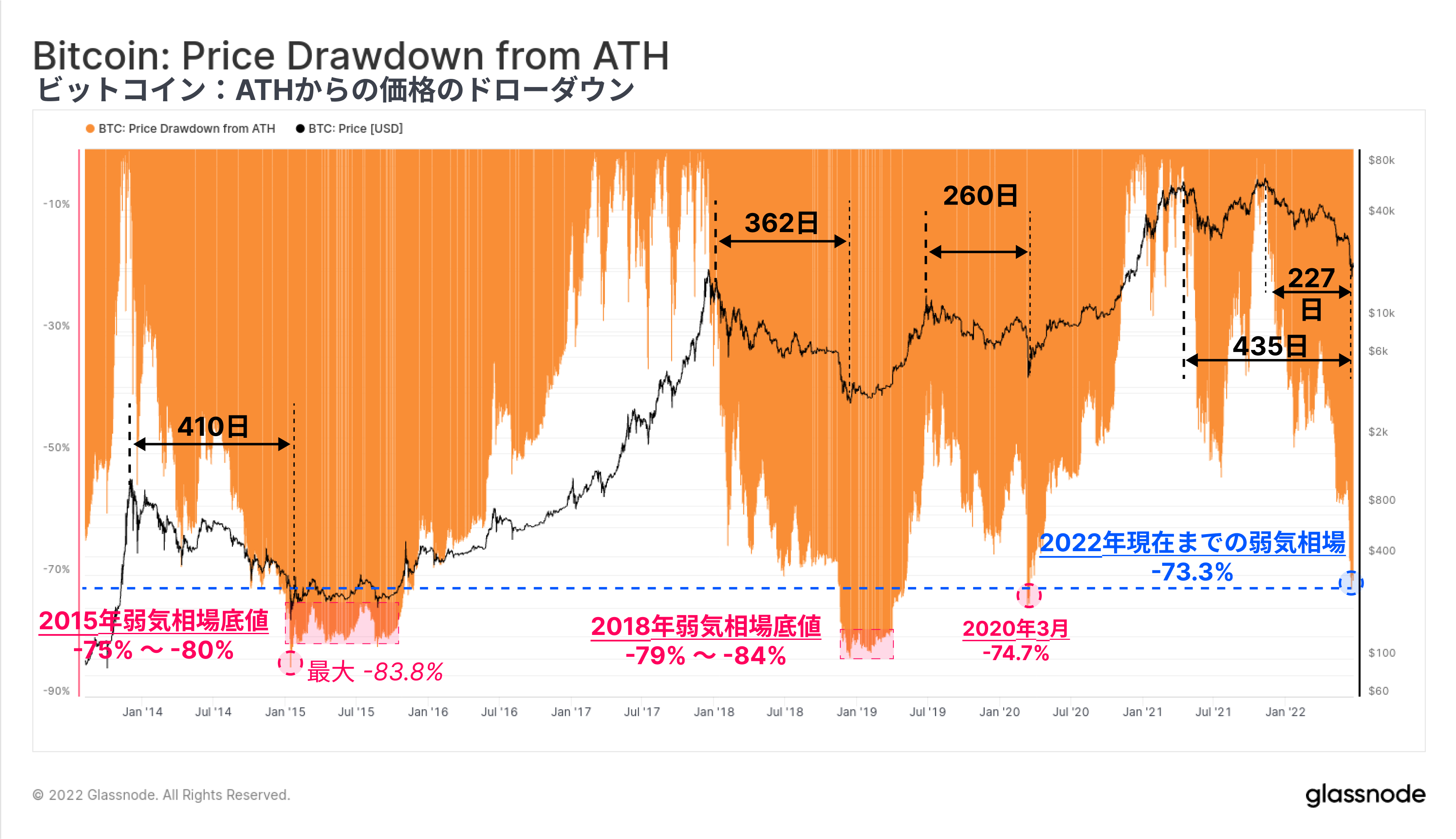 現在のドローダウンは2021年11月のATHから-73.3%まで達しており、持続期間は227日から435日に至る。この弱気市場は現在、歴史的な水準と規模の中に確実に収まっている。