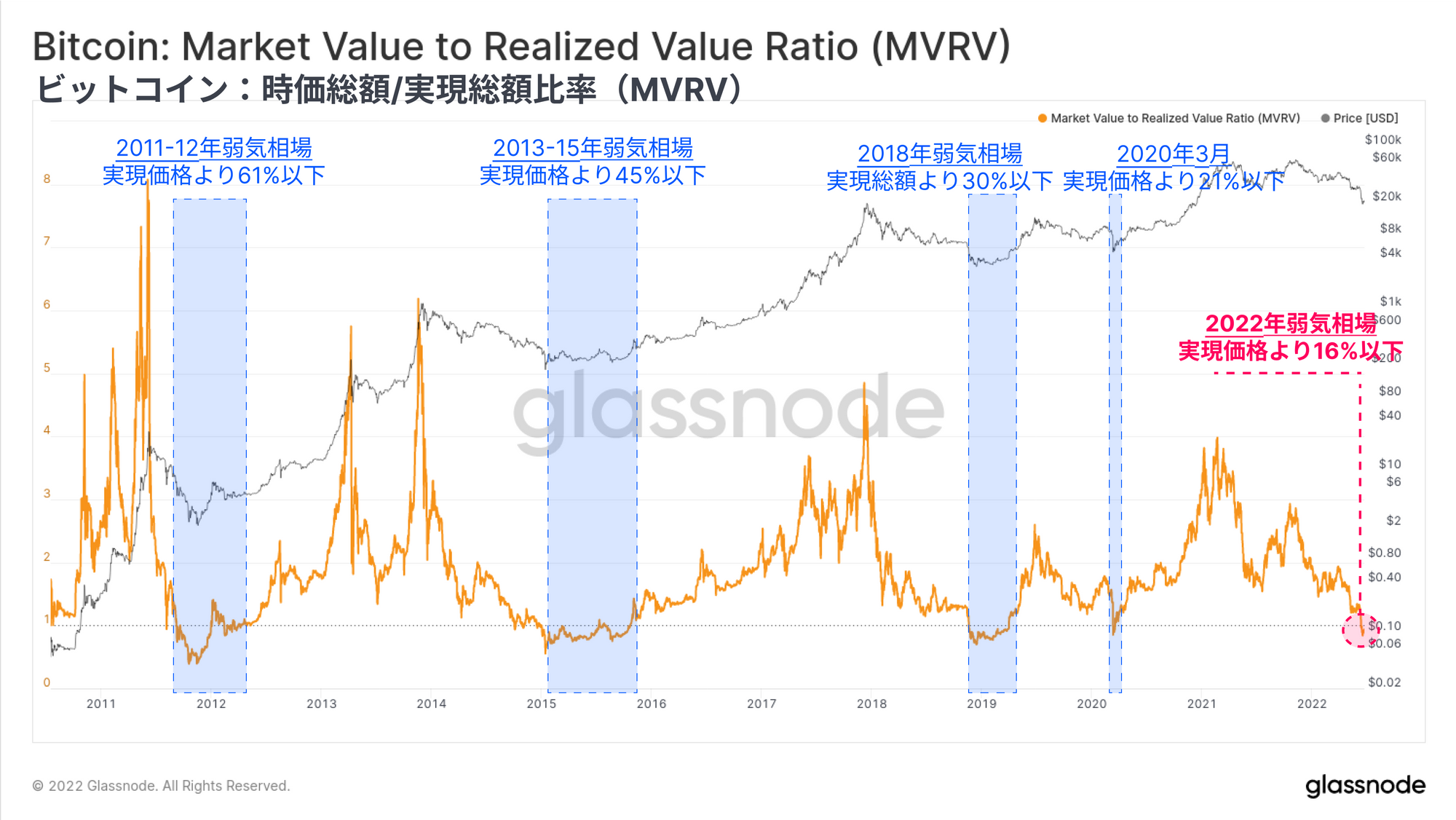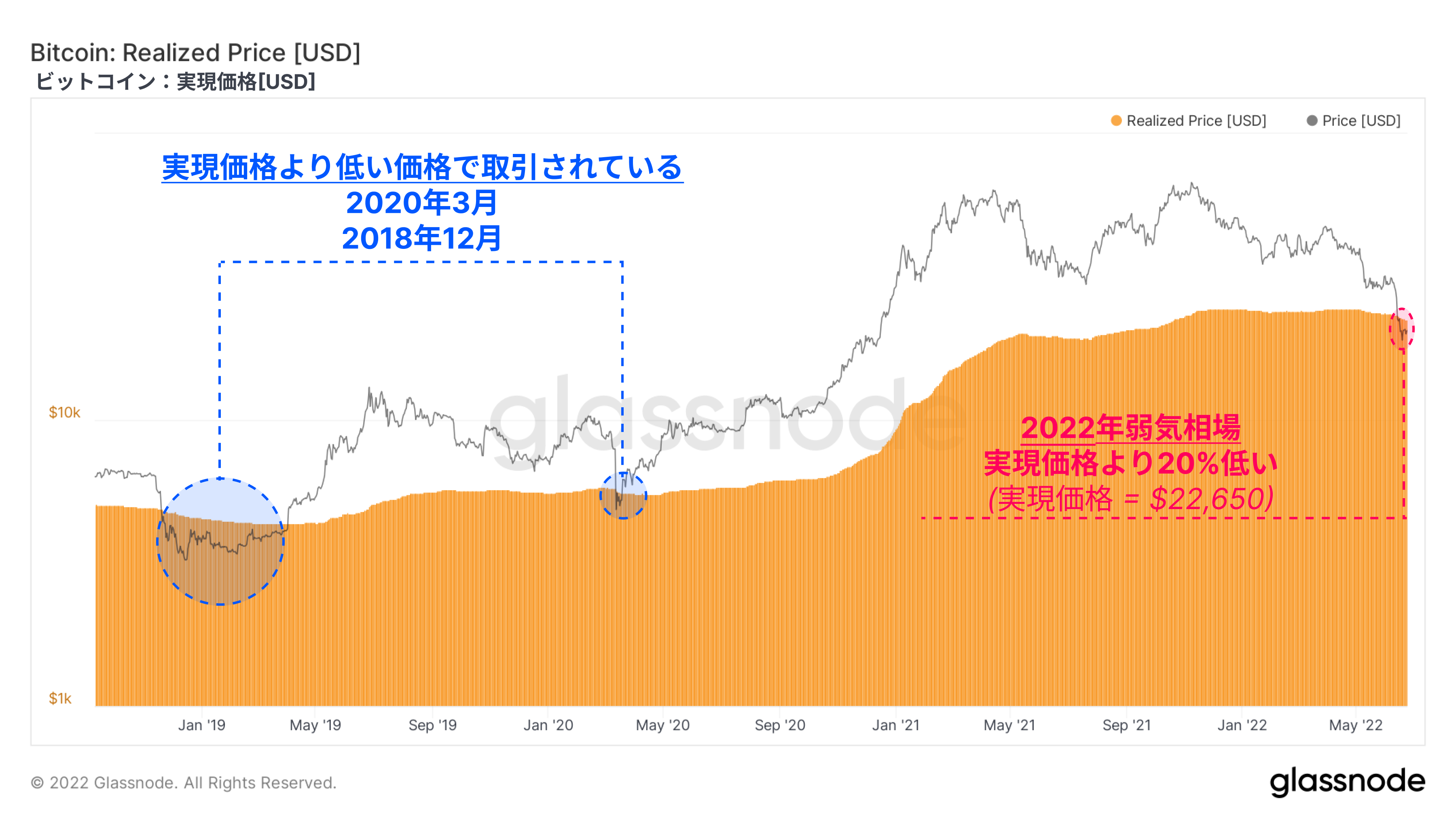 ・ビットコインのスポット価格は実現価格を大きく下回っており、市場投資家は平均的に保有資産が含み損になっていることを示している。