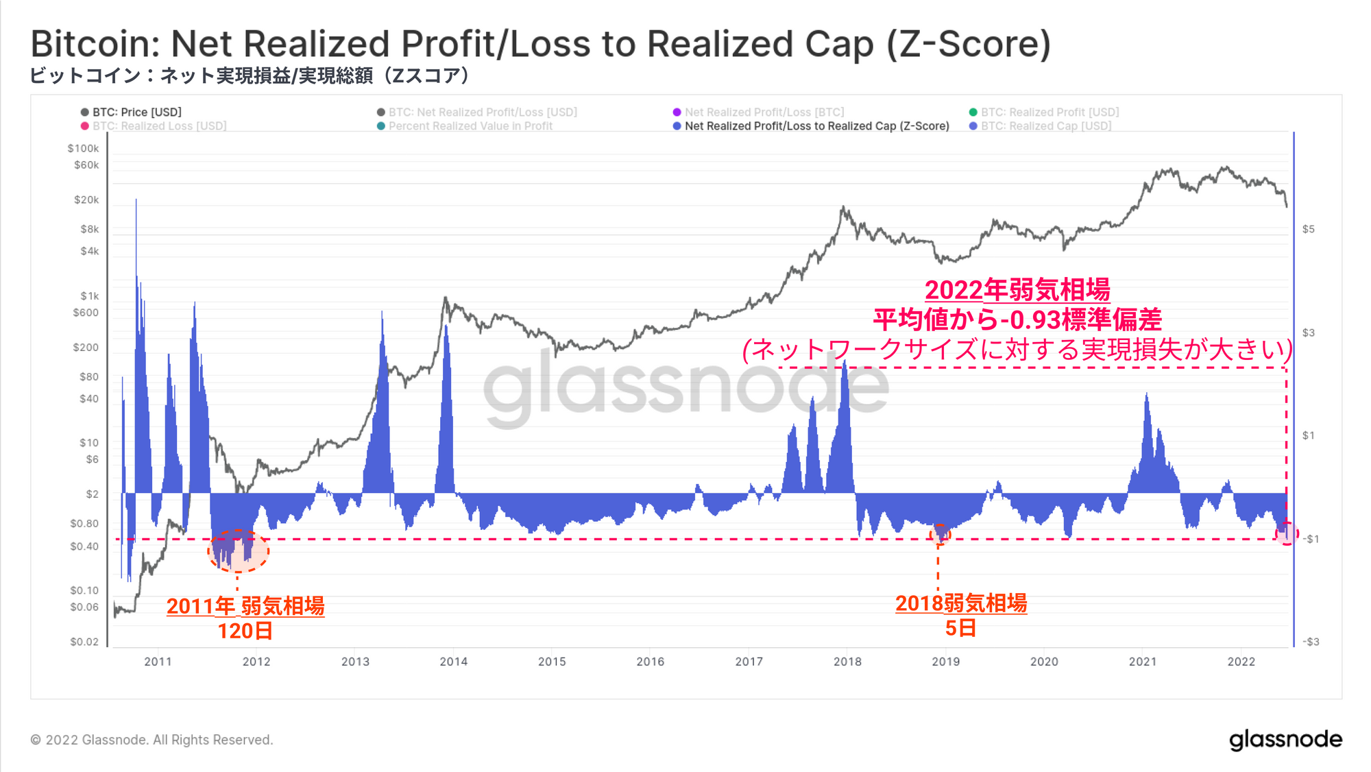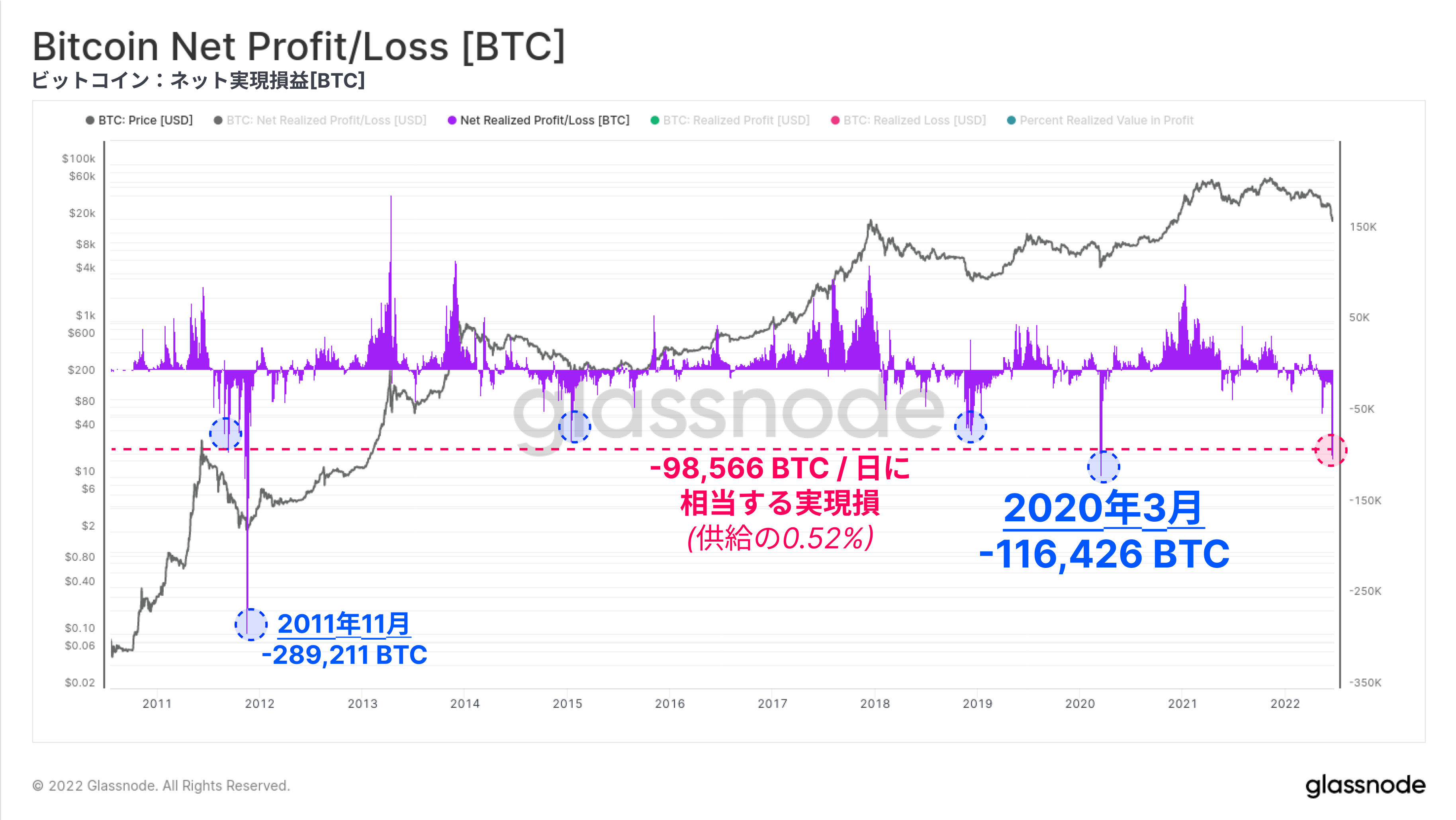 ネット実現損益をBTC単位で測定し、市場規模を効果的に正規化すると、現在のドローダウンでは1日あたり-98,566BTC(流通量の0.52%)に相当する実現損失が記録されていることがわかる。これより大きな実現損失を記録した取引日は、2011年の弱気相場と2020年3月の2回だけである。