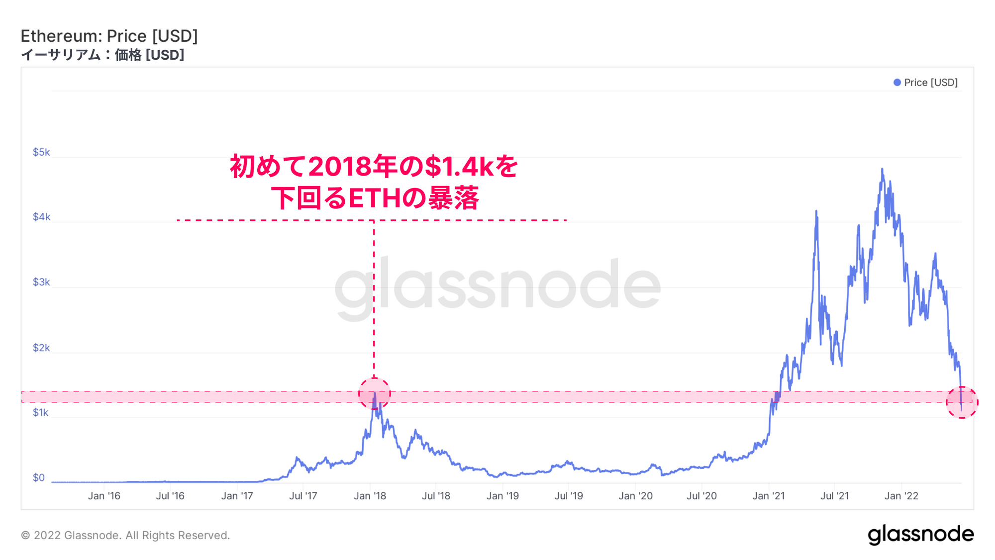 第2位のデジタル資産であるイーサ(ETH)の価格も、2018年サイクルのATHである1.4kドルを下回り、無傷とは言い難い状況である。主要なこれらのデジタル資産は、サイクルのATH下で取引されており、ATHが「割れない」サポートラインがもたらすという話はあっという間に払拭された。
