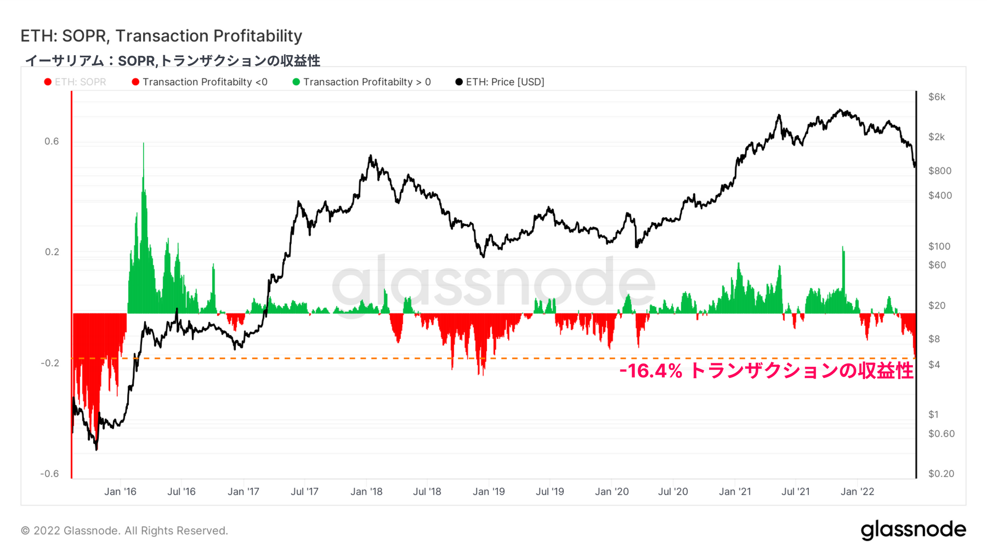 実現損失が大きく優勢になるのは、弱気相場における価格の下降に伴うものであることがわかる。現在の市場では、ETH取引者は平均的に売却したコインに対して-16.4%の損失を実現している。このようなトランザクションの収益性の低さは、ETHが84ドルで取引されていた2018年の弱気市場の深層部で最後に見られた。