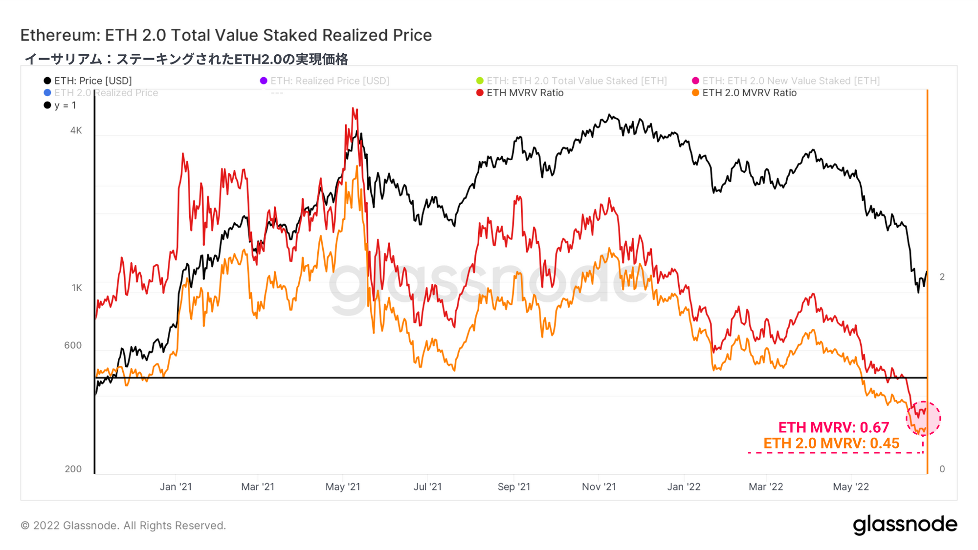 ・ETHとETH 2.0のMVRVによると、大幅なドローダウンが発生しており、ETH保有者が平均的に大きな含み損を抱えていることを示唆している。