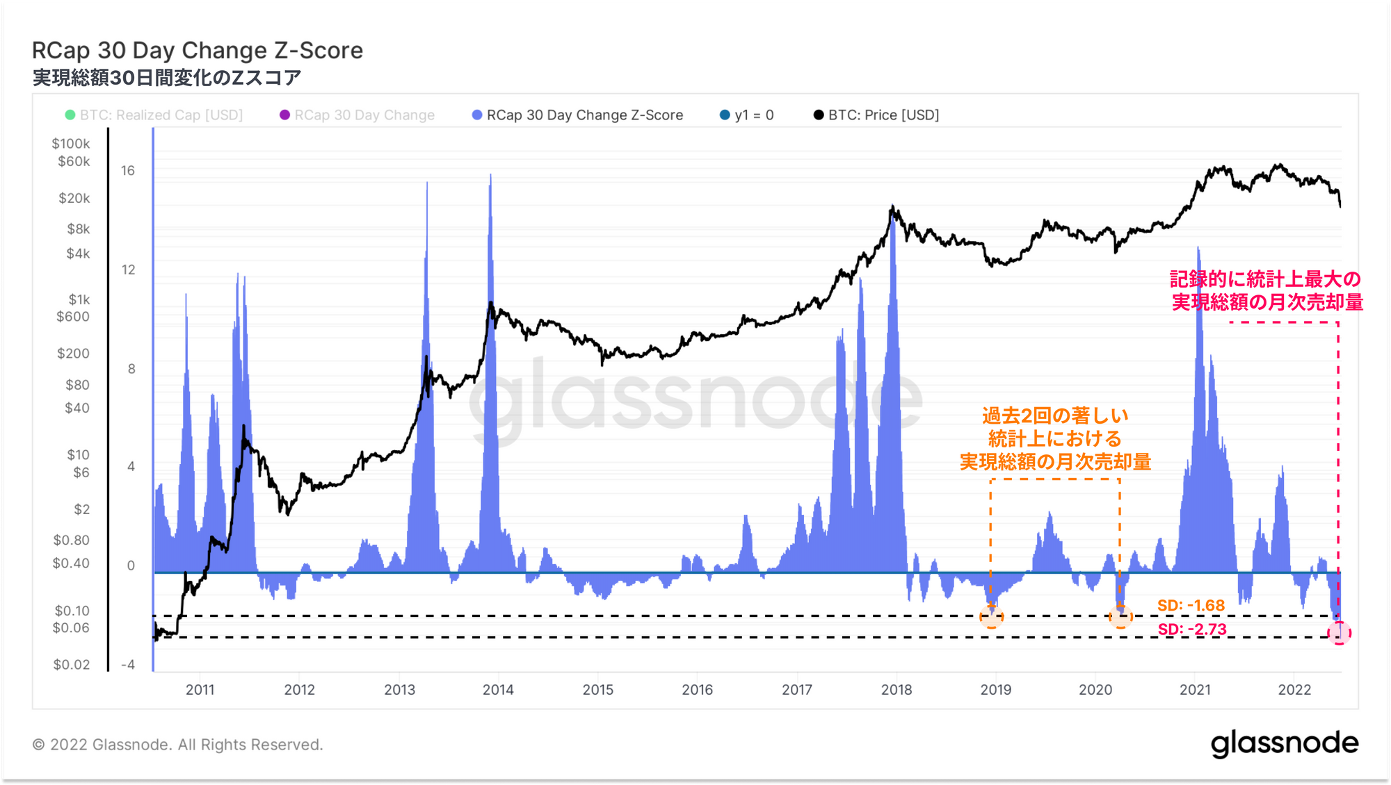 実現総額の30日間ポジション変化(Z-Score)により、BTC資産への毎月の相対的な資本流入/流出を統計ベースで見ることができる。この指標によると、ビットコインは現在、史上最大の資本流出イベントを経験しており、平均から-2.73標準偏差(SD)を記録している。これは、2018年の弱気相場の終わりと、2020年3月の売り相場で発生した最大のイベントよりも1SD大きい。