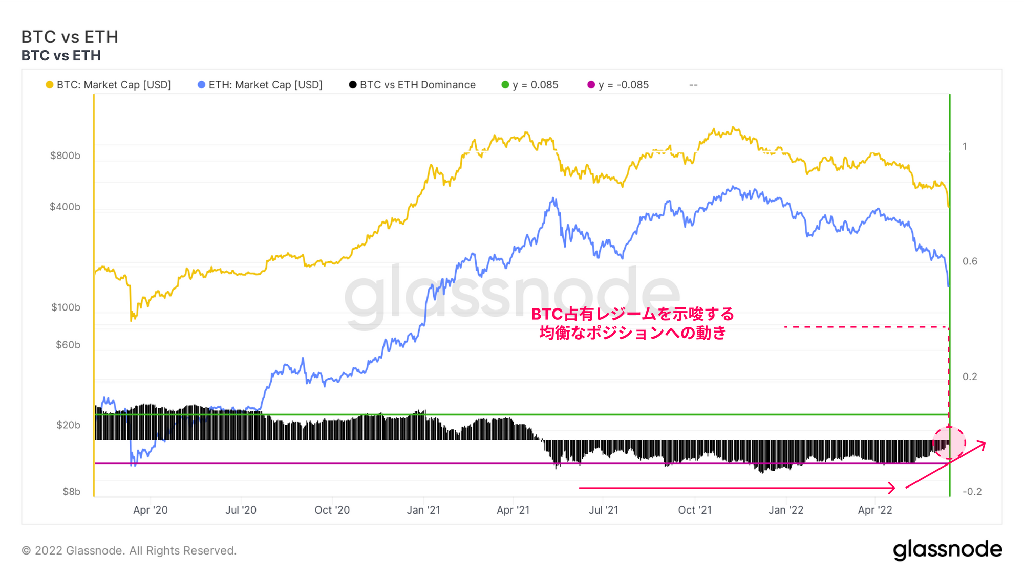 イーサリアムの優位性は2021年11月のATH以降、顕著に低下しており、歴史的にビットコインのアウトパフォーマンスの長期的な期間を先行する分岐点に近づいている。ETHがBTCをアンダーパフォームし、また両者は米ドルをアンダーパフォームする傾向があり、市場の一般的なリスクオフセンチメントによる集中状態が浮き彫りになっている。