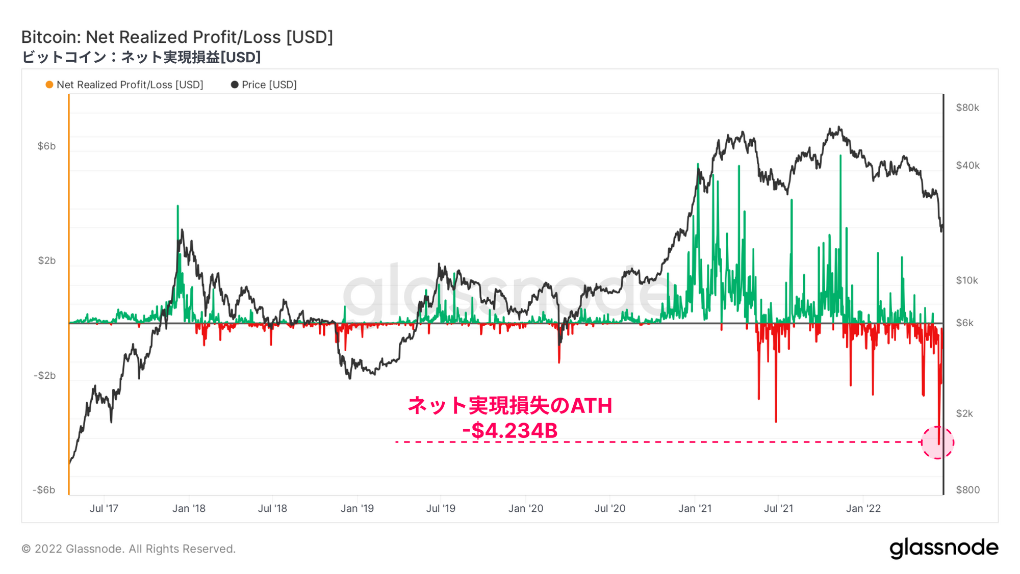 ネット実現損益(Net Realized Profit/Loss)指標は、投資家がその日にコインを売却することで発生する純資本のフロー体制を把握するものである。最近発生した2万ドル台にかけた価格崩壊では、史上最大の日次米ドル建て実現損失を伴いピリオドを打った。投資家は1日で-42億3400万ドルの損失を確定し、これは2021年半ばに記録した34億5700万ドルから22.5%増加した。