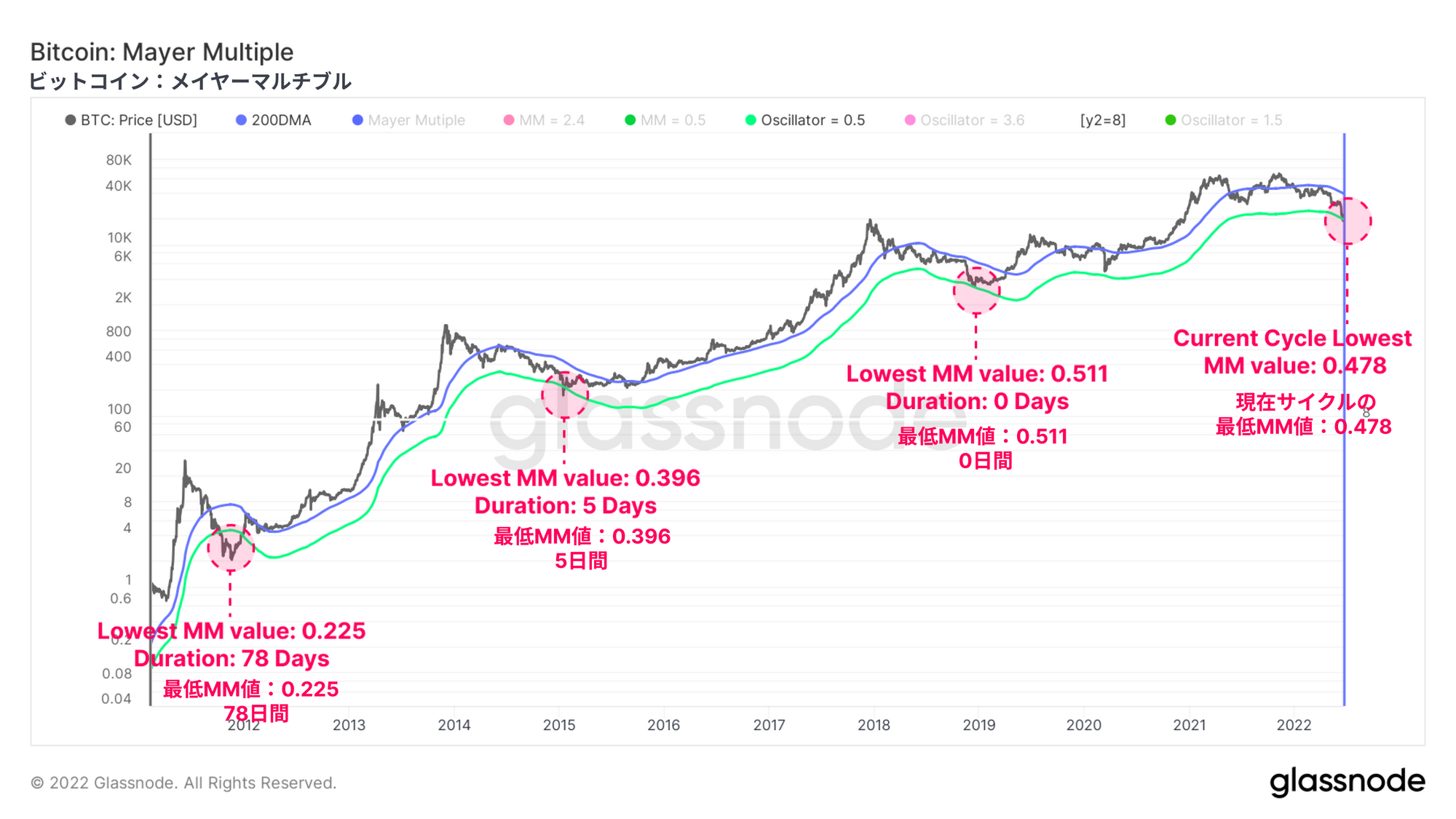 長年にわたり、ビットコインにおけるマクロスケールの値動きは、この枠組みに準ずる傾向がある。200DMAを長期的な平均値とすると、メイヤー・マルチプル(MM)は上下の価格の乖離を記録し、買われすぎと売られすぎの状態を示す。
