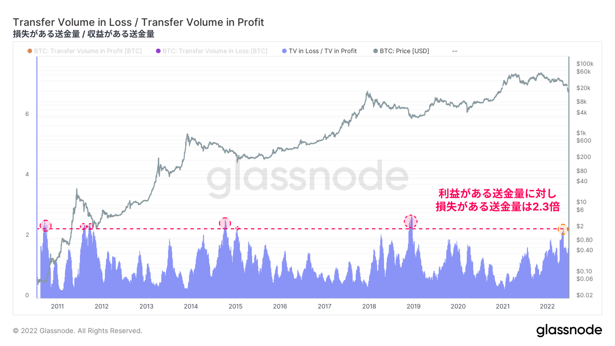 2022年5月に発生したLUNAの暴落では、損失のある取引高と収益のある取引高の比率が2.3倍の倍率に達している。これは、収益のある取引高に対して損失のある取引高が2.3倍多く取引されたことを意味する。歴史的に見ても、このような一方的な市場は珍しく、損失のある取引高の割合がこれほど大きいということは、投資家による著しいキャピチュレーションが起こっていることを物語っている。
