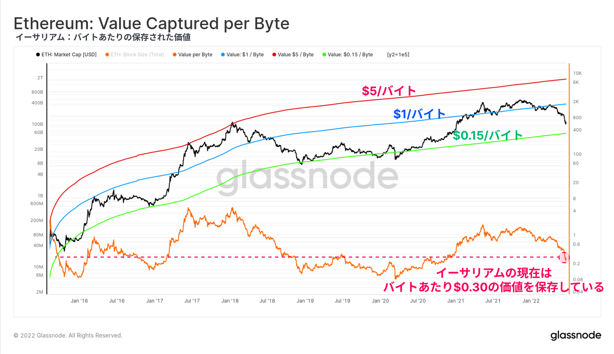 イーサリアムは現在、1バイトあたり0.30ドルを保存している。これは歴史的に後期弱気相場や市場の安値で見られる、1バイトあたり0.15ドルという下限より2倍高い。残念ながらこのことは、歴史が繰り返された場合、さらに-50%の下落があり得ることを示唆している。しかし、これはイーサリアムネットワークによる価値の獲得に根本的な改善がないことを前提としている。DeFiやNFT、そして現代のインフラの多くは2018年には存在していなかった。