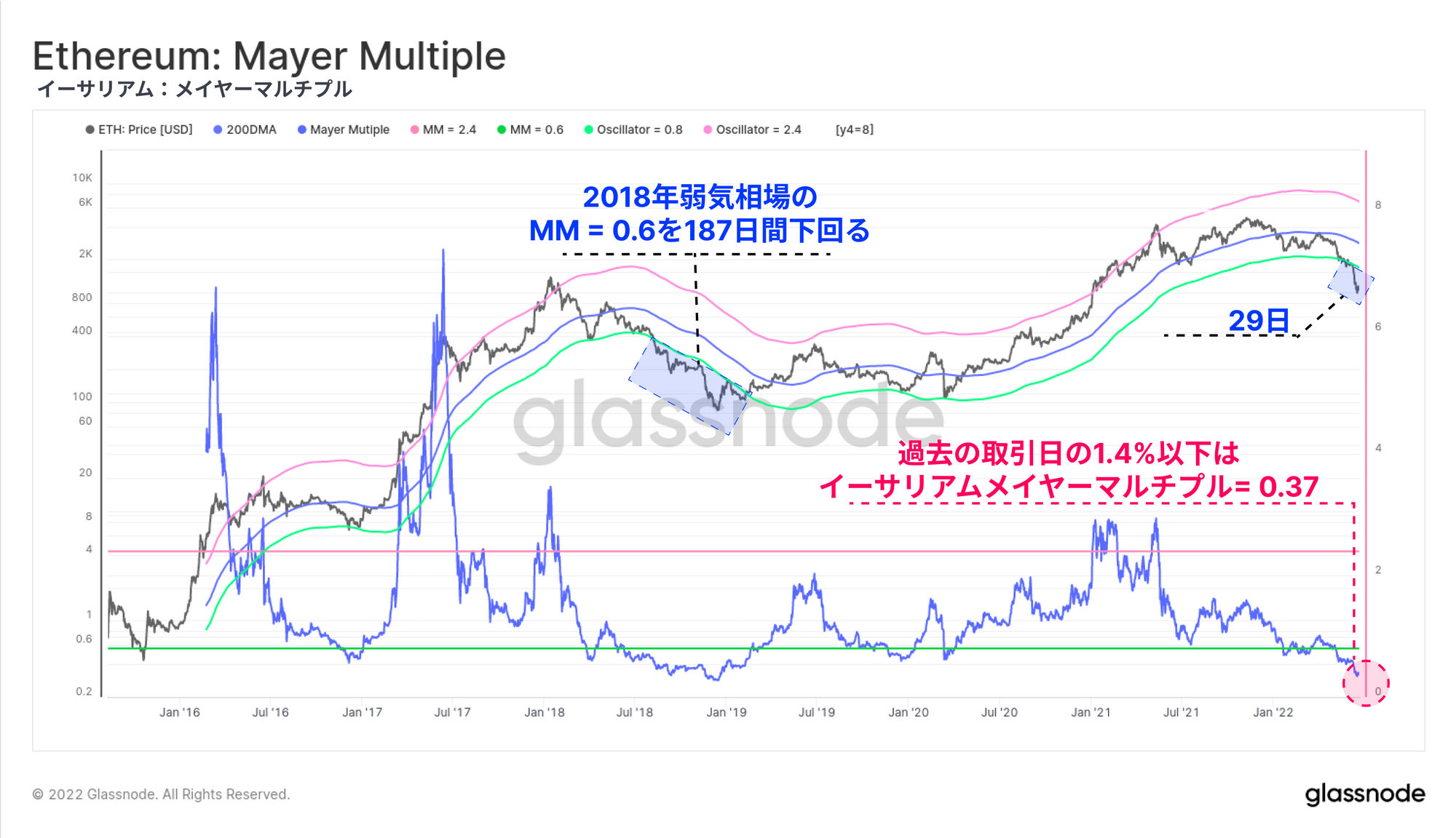 0.6のメイヤーマルチプルバンドは、ETHの全取引日の約10%がそれを下回る下降偏差のレベルを表している。2018年の弱気相場において最もETHの価格が悪化した間、このバンドの下で187日間が経過した。現在の市場では、ETHは6月上旬からこのバンドの下で取引されており、現在29日間このバンドを下回り続けている。