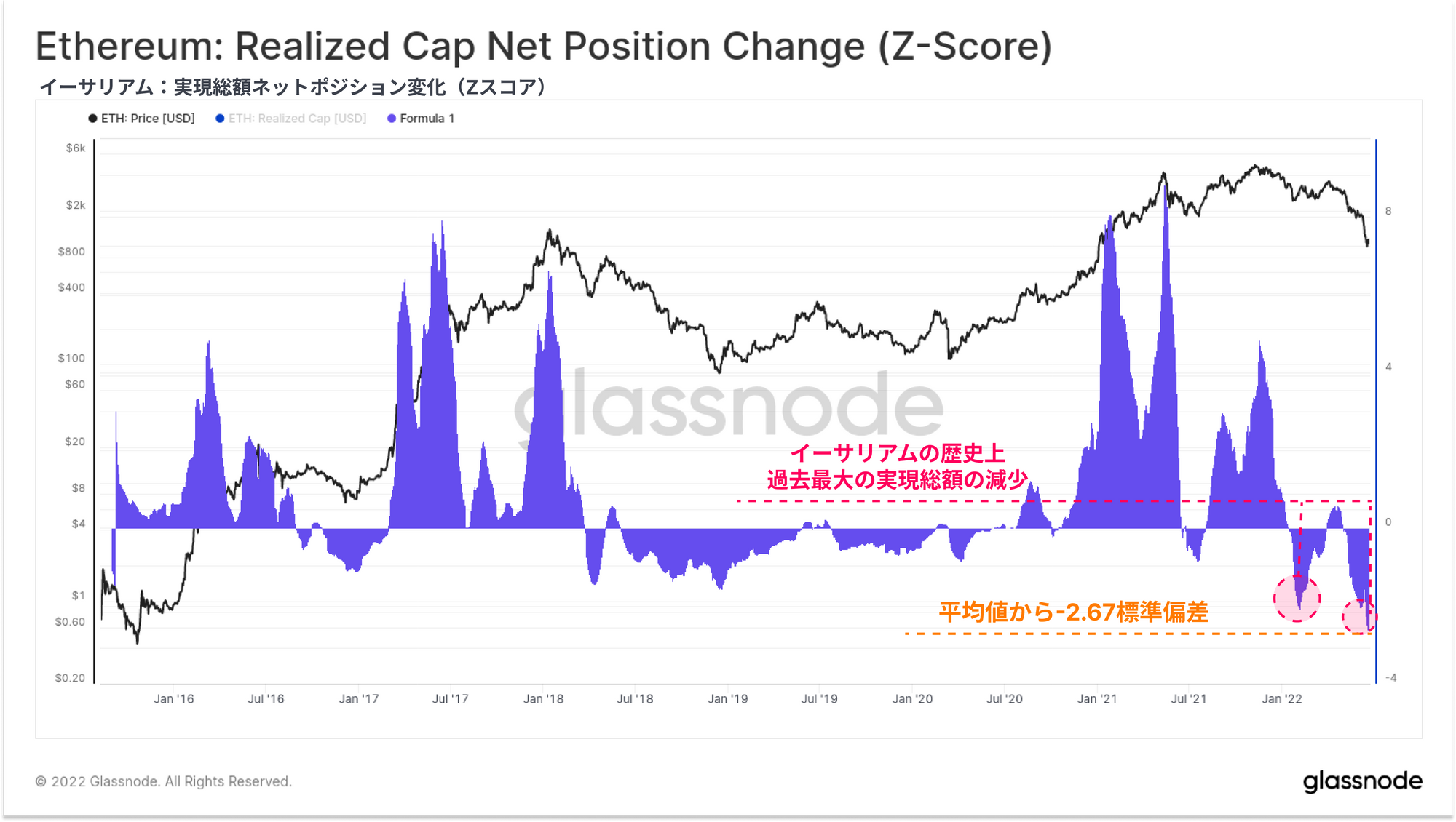 イーサリアム実現総額の月次変化を調べ、ネットワークからの正味の資本流出を再び示すことで締めくくりとしたい。ここでは、最近の下落が2つのキャピチュレーションイベントによって激化していることがわかる: