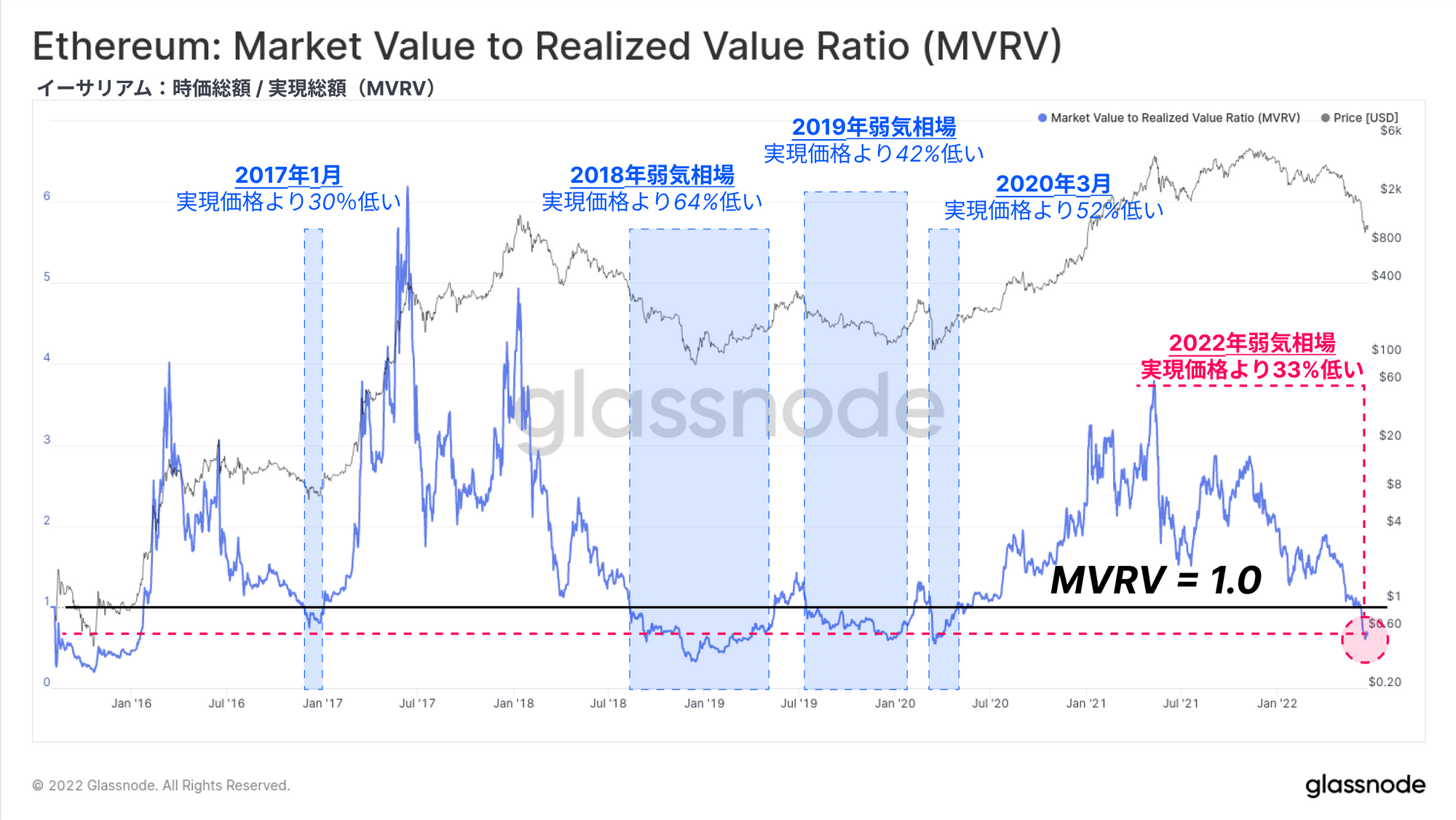 ここで、ビットコインで使用したものと同様のフレームワークを実装することで、イーサリアムの実現総額を評価し、ビットコインとイーサリアムの弱気相場の規模を比較する。イーサリアムのMVRV比率は現在、均衡を大きく下回る負の偏差に達しており、現在の市場は全体で-33%の含み損を抱えていることを示している。