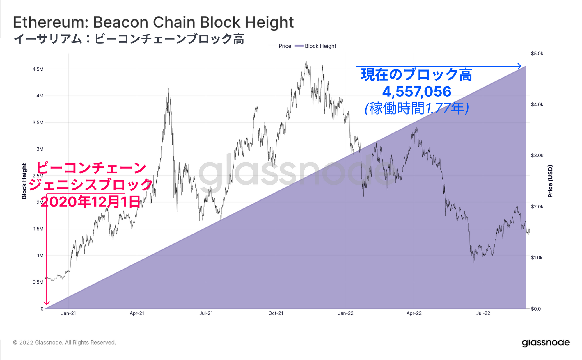ビーコンチェーンのジェネシスブロックは2020年12月1日であり、この新しいネットワークは本稿執筆時点で639日(1.77年)稼動している。チェーンチップはブロック高4,557,056、エポック高142,408を突破している。