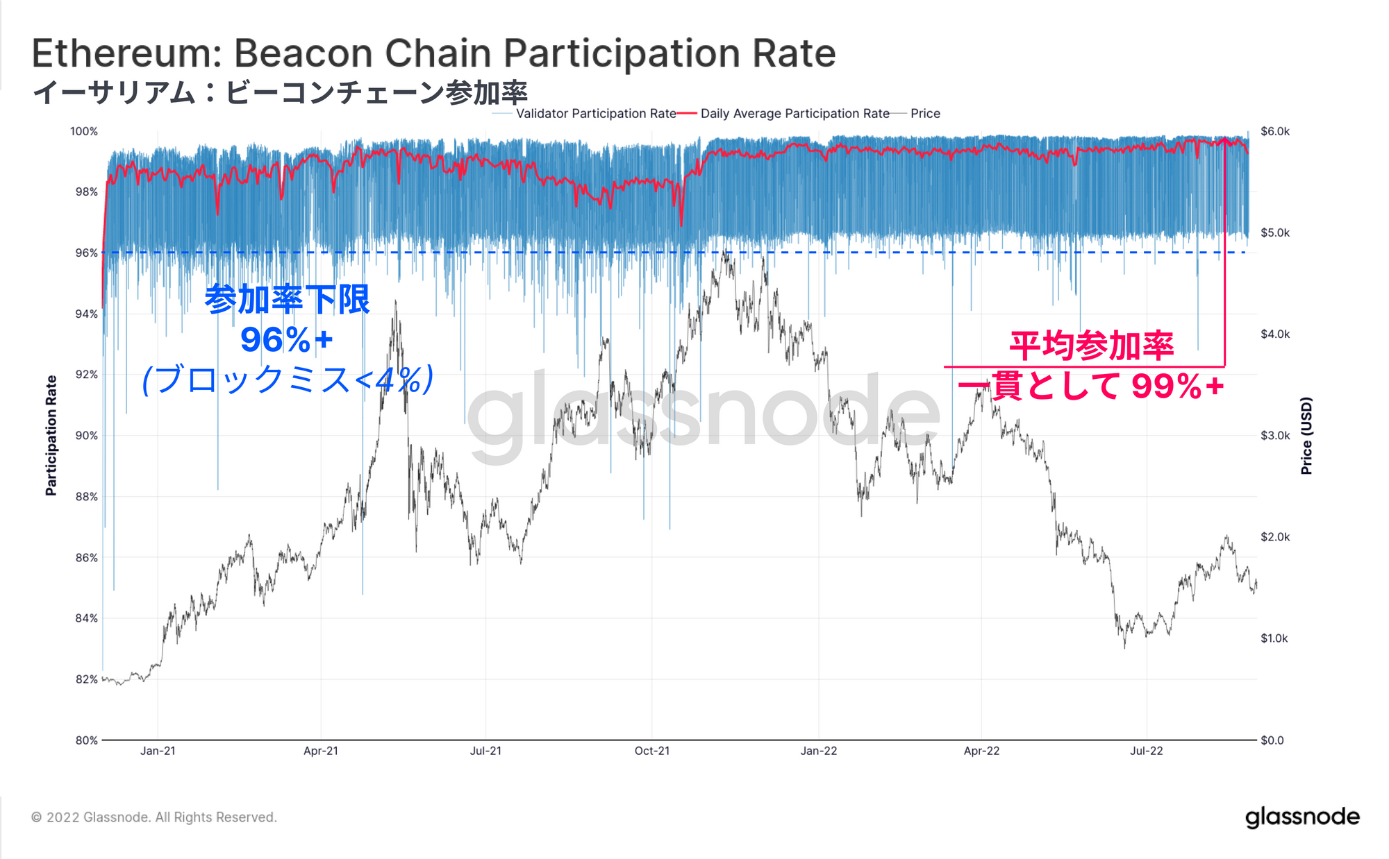 ブロックチェーンは高い信頼性を維持することが望ましいが、これはバリデータノードの稼働率が高い結果であり、ミスブロックを非常に少なくすることにつながる。参加率とは、ブロックの生成に成功した数(つまりミスしなかった数)と、利用可能なスロットの合計との比率である。
