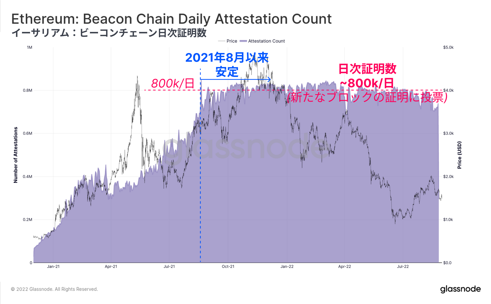 平均スロット間隔が12秒で、認証するバリデータが127人であることから、1日の証明件数は783k~914k件と安定していることが予想される。実際、2021年8月以降、1日の総証明数はこの範囲内で安定しており、1日あたり約80万件の証明投票を獲得している。