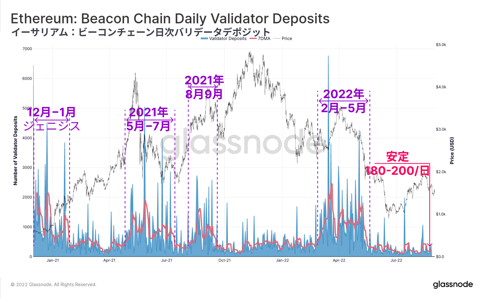 平均より高い預入金流入が顕著な期間が4回あり、3回は2020-21年の強気相場、直近は2022年2-5月である。トークン価格と信頼性に対し市場全体にマイナスの影響を与えたLUNA-USTプロジェクトの崩壊後、預入金は減速している。