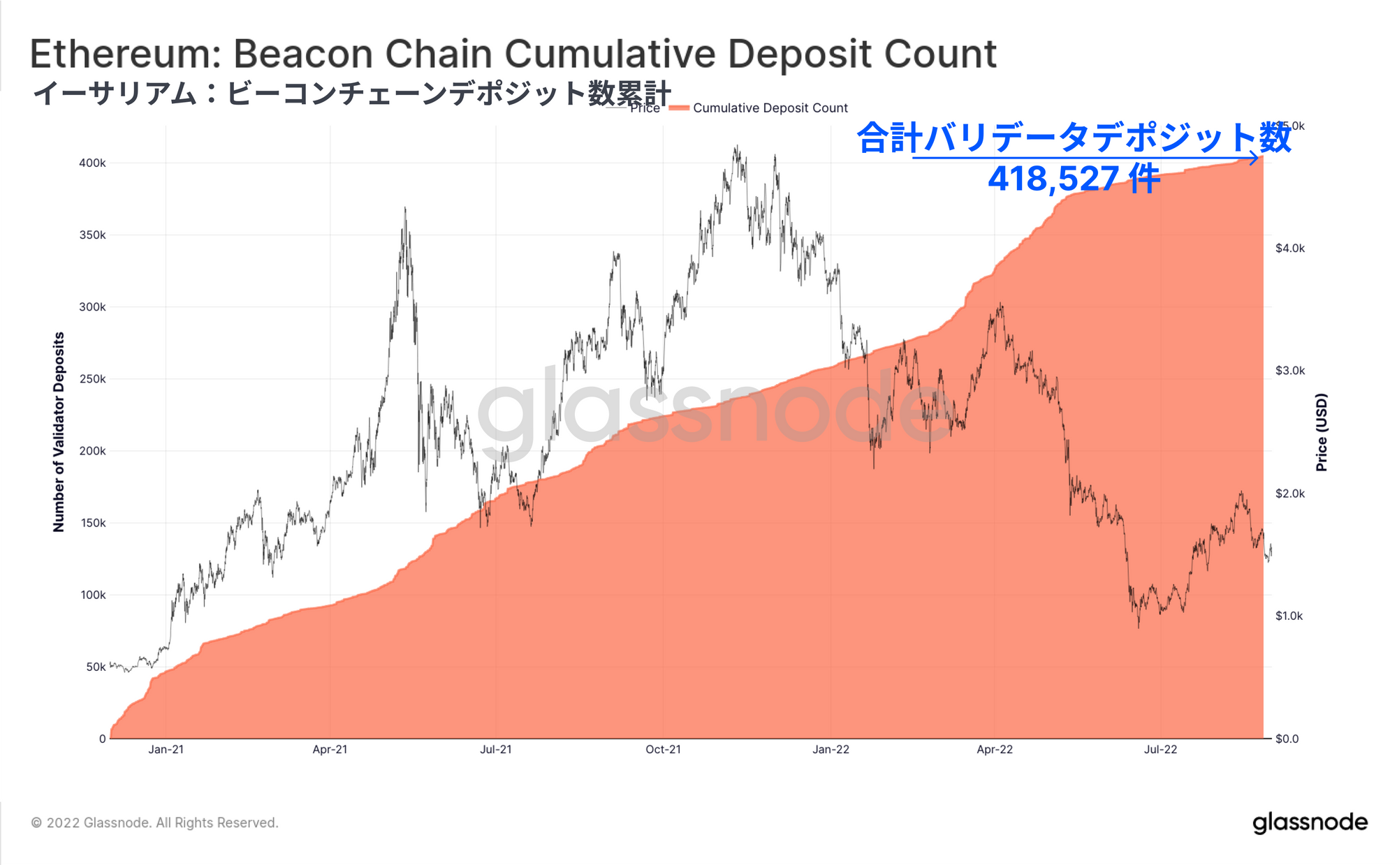 合計で、投資家はバリデータとして必要な32ETHの入金を418,527回以上完了している。これはコンセンサスレベルのバリデータの数を反映しているが、バリデータノードの運営者は、同時に複数のバリデータを保管、運営、維持できるため、この指標はユニークなバリデータの数を測定していないことに注意してください。