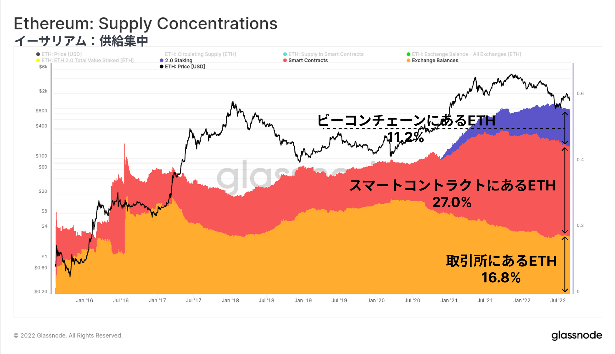 ビーコンチェーンにステークされたETHの総量は、現在13.409M ETHを超え、流通供給量の11.22%に相当している。現在、ビーコンチェーンのデポジットコントラクトは、イーサリアムネットワーク上で最大の供給の一つとなっている。ビーコンチェーンの総ステーク量は、供給量の27.0%を保有するすべてのスマートコントラクトのETH、および供給量の16.8%を保有する中央集権型取引所と比較できる。