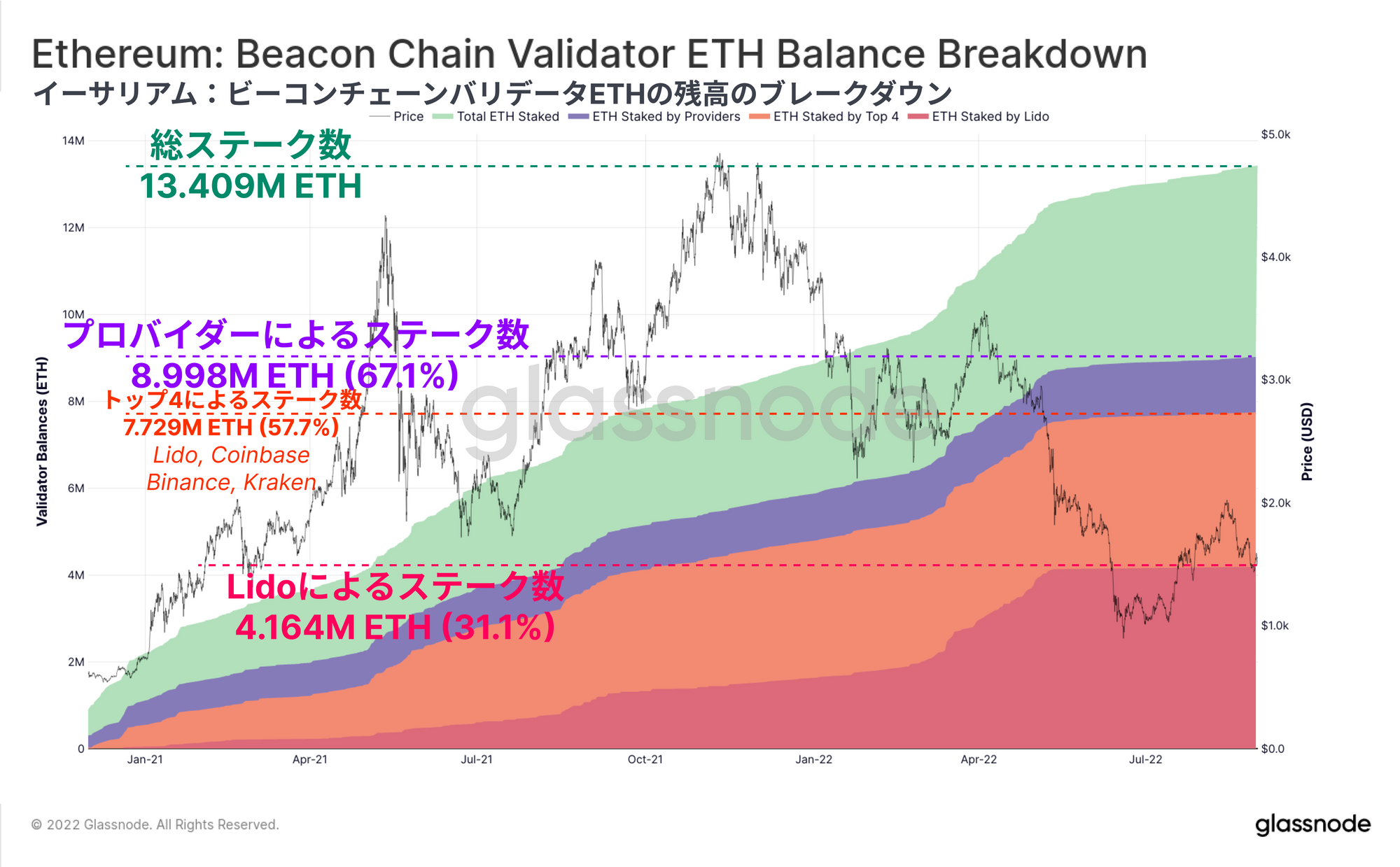 ・その他のステークプロバイダー(紫色)は、さらに1.269M ETHとバリデータプールの9.5%を占めている。これらの前述のステーキングプールオペレーターをすべて合わせると、8.998M ETHのステークを表し、バリデータプールの67.1%を管理している。