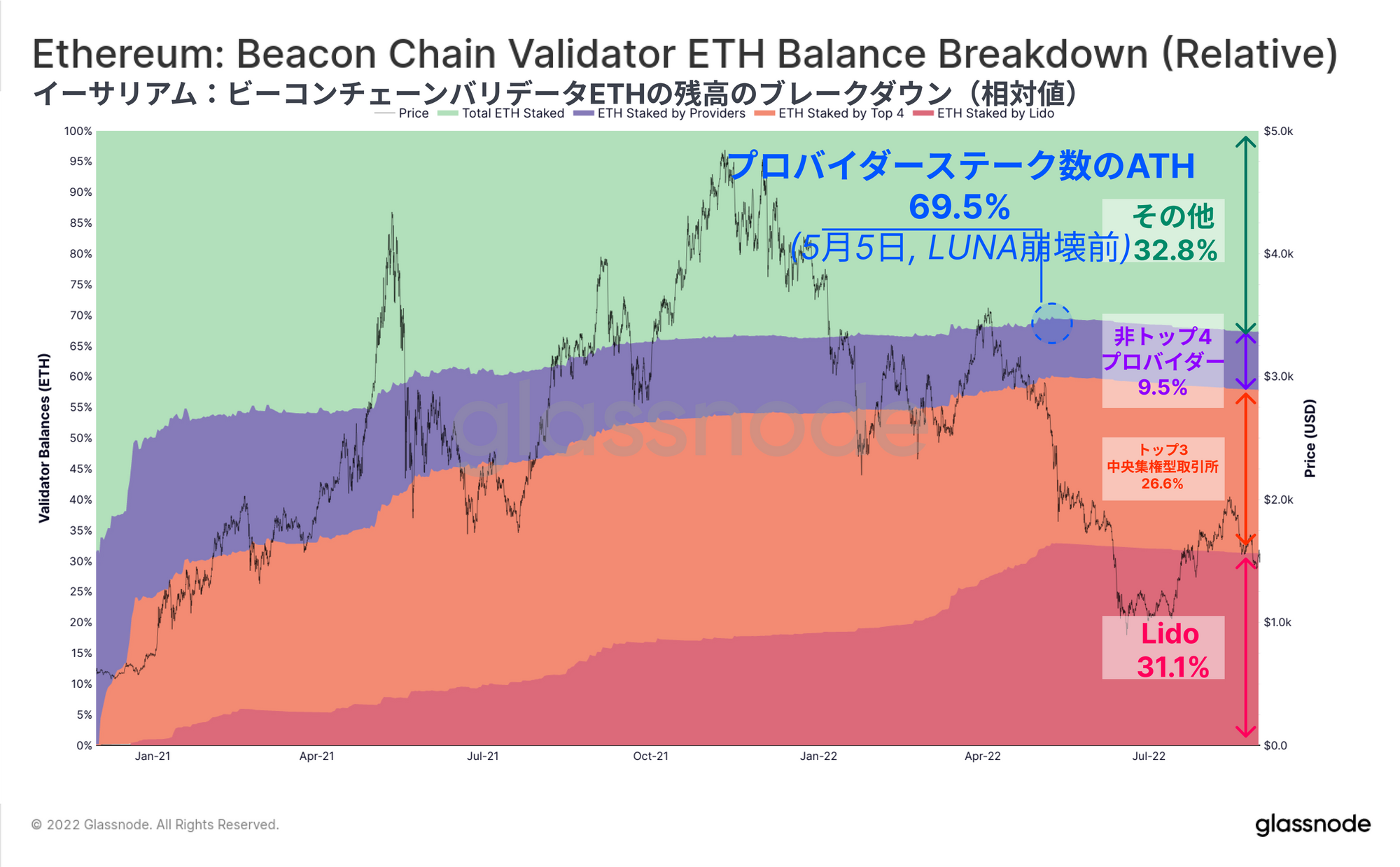 興味深いことに、「不明と単独のステーカー」コホート(緑色)は、LUNA-USTの崩壊を受け、その支配力をわずかに高めている。ステーキングプロバイダーの支配率は69.5%でピークに達し、その後67.2%に減少している。