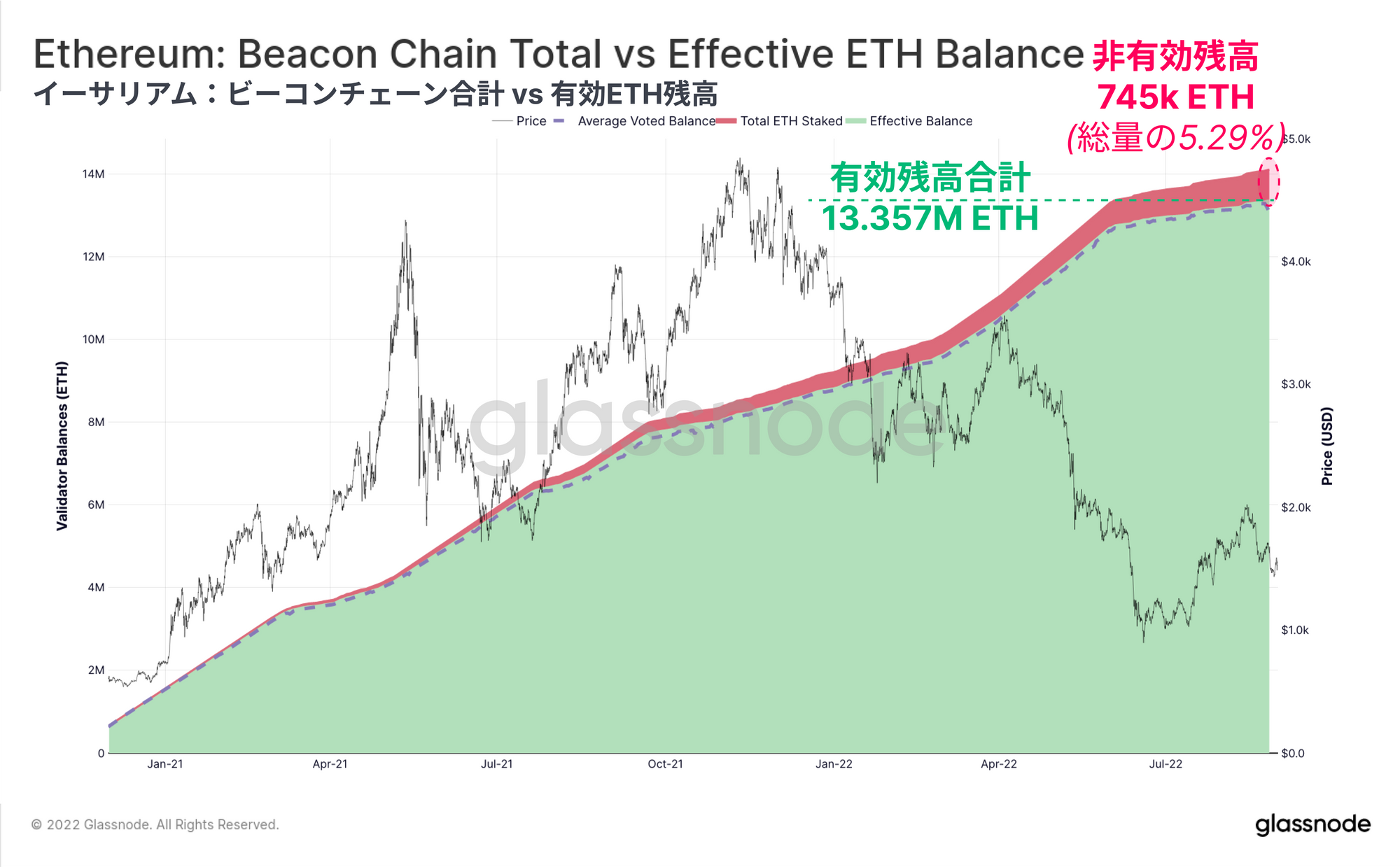 下図は、PoSコンセンサスに積極的に参加している有効残高の合計(緑色)を示している。残りの合計残高(赤色)は、基本的に余剰のETHで、非アクティブなステークのバッファーと考える。現時点では、有効残高の合計は13.357M ETHで、約745k ETHが非アクティブである(全体の5.29%)。