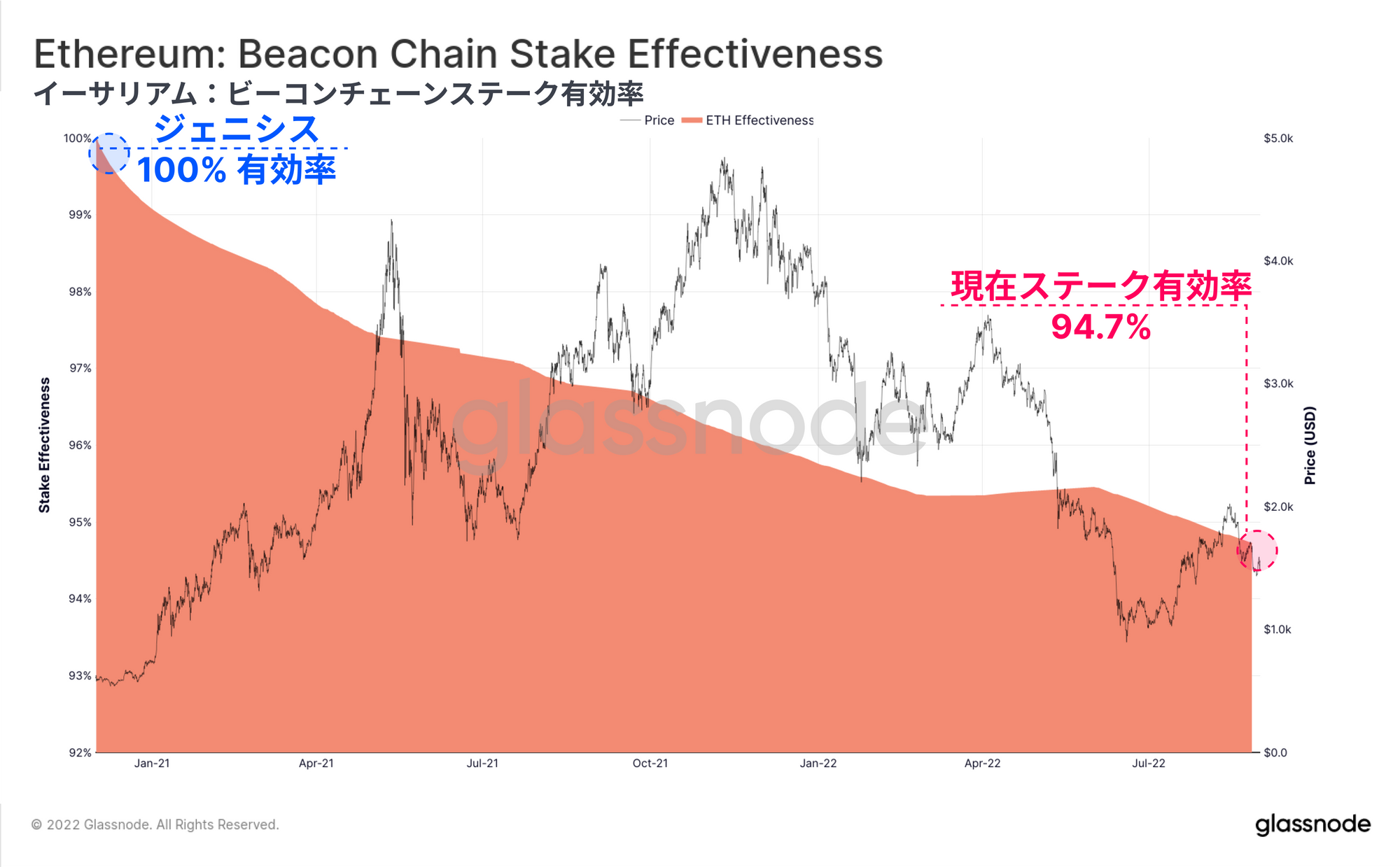 下の青色の曲線は、各エポックについて測定された参加率を示しており、一般に96%より高いことがわかる。赤色の曲線は1日平均の参加率を示しており、特に2021年11月の市場価格ATH以降、一貫して99%以上の参加率を記録している。これは、これまでのところ、ビーコンチェーン上のバリデータは一貫してオンラインであり、スロットが割り当てられたときにブロックを生成していることを示している。