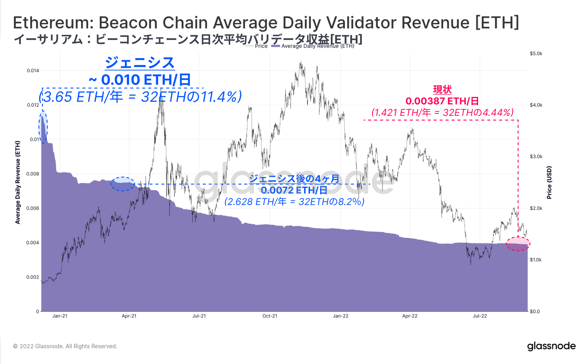 32ETHの預り金に対する年率換算のETH建ての利回りはそれに応じて低下し、ジェネシス時の15%以上から、今日ではわずか4.44%に低下している。マージ後、投資家はアップグレードの成功に安心感を覚え、追加でデポジットすることによりこの利回りはさらに低下すると思われる。