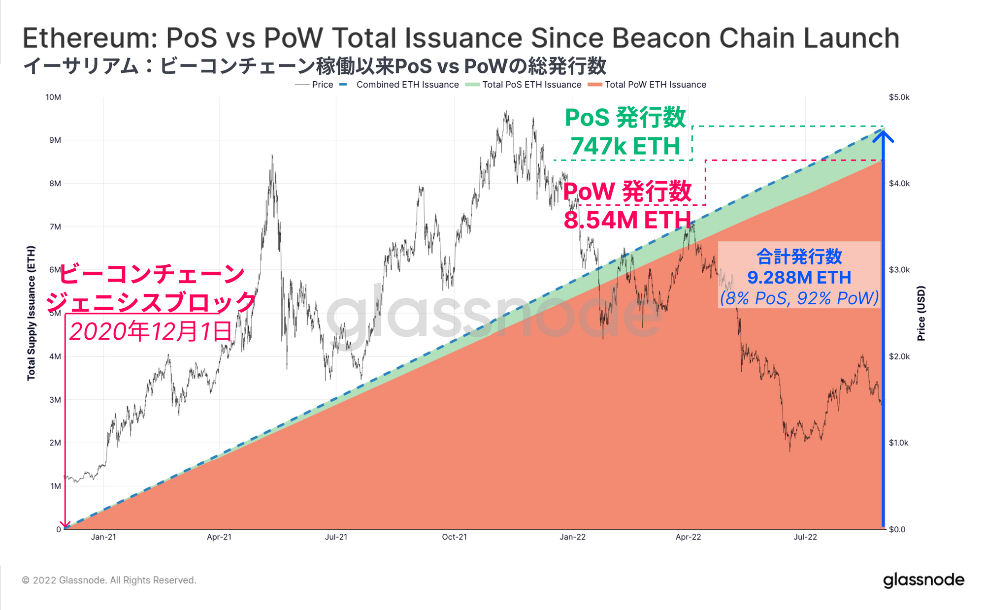 PoSビーコンチェーンと既存のPoWのイーサリアムチェーンの両方が稼働しているため、ETHの総発行量は現在2つのソースを持っている。ビーコンチェーンのジェネシスブロック以来、PoSチェーンでは合計747k ETHが発行され、PoWチェーンでは8.54M ETHが発行されている。これは、約8%のPoSと92%のPoWという発行比率に相当する。