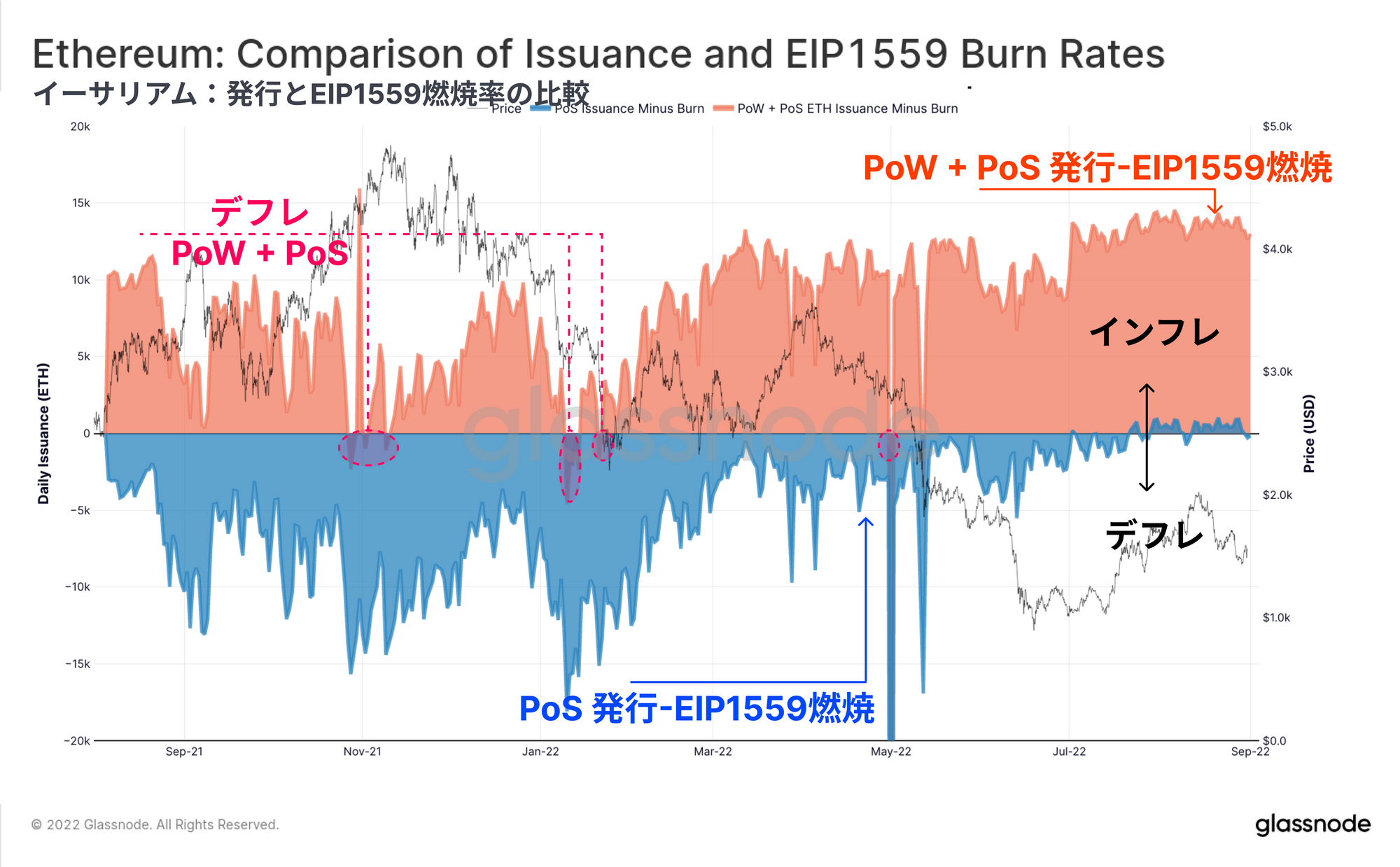 ・シミュレーション状況(青色):PoSビーコンチェーンだけがアクティブであり、EIP1559がPoSチェーン上でライブの状態である。これは、もしマージがEIP1559と一緒に稼働されていたら市場がどうなっていたかをシミュレートしたもので、2022年7月後半までは明らかな実質デフレ体制であり、発行量は+500~+1,000ETH/日程度に安定することがわかる。