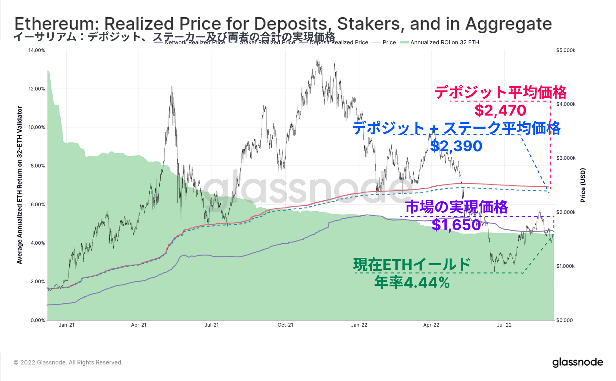 ・ステーキング報酬(青点線)を含むビーコンチェーンの実現価格は2390ドルで、これはステーカーのコストベースに対する平均3.2%の利益となるが、平均的な市場参加者を大きく上回っていることに変わらない。