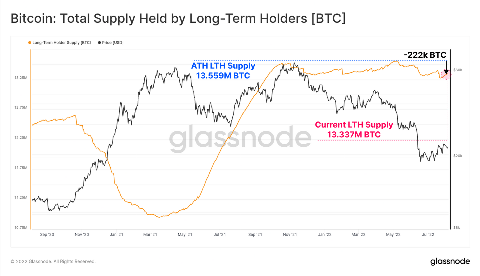 長期保有者コホートは、5月の初めから実質約222k BTCを分配しており、これは彼らの過去最高の保有量における約1.6%に相当する。