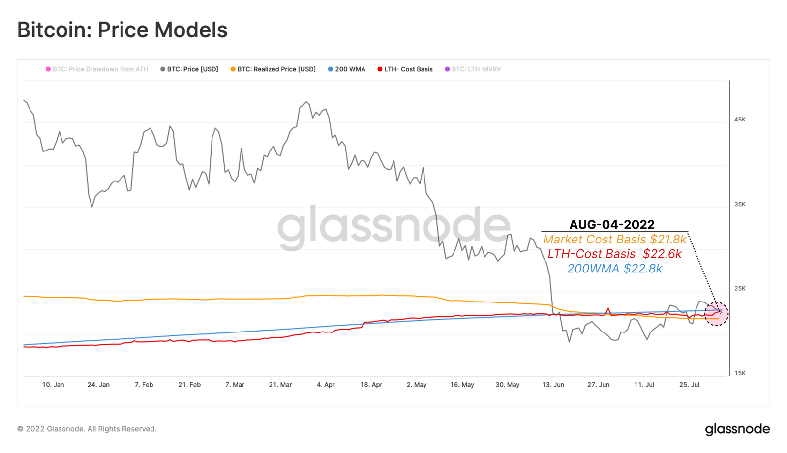 マクロ環境におけるあらゆる不確定性にもかかわらず、暗号資産市場は7月中旬以降、有意な回復を経ている。ビットコイン価格は、200周移動平均線、長期保有者コストベーシス(LTH-Cost Basis)、市場平均コストベーシス(実現価格、Realized Price)を含む、心理的に重要な2つのレベルを取り戻し、一時的に~24kレベルをタッチした。