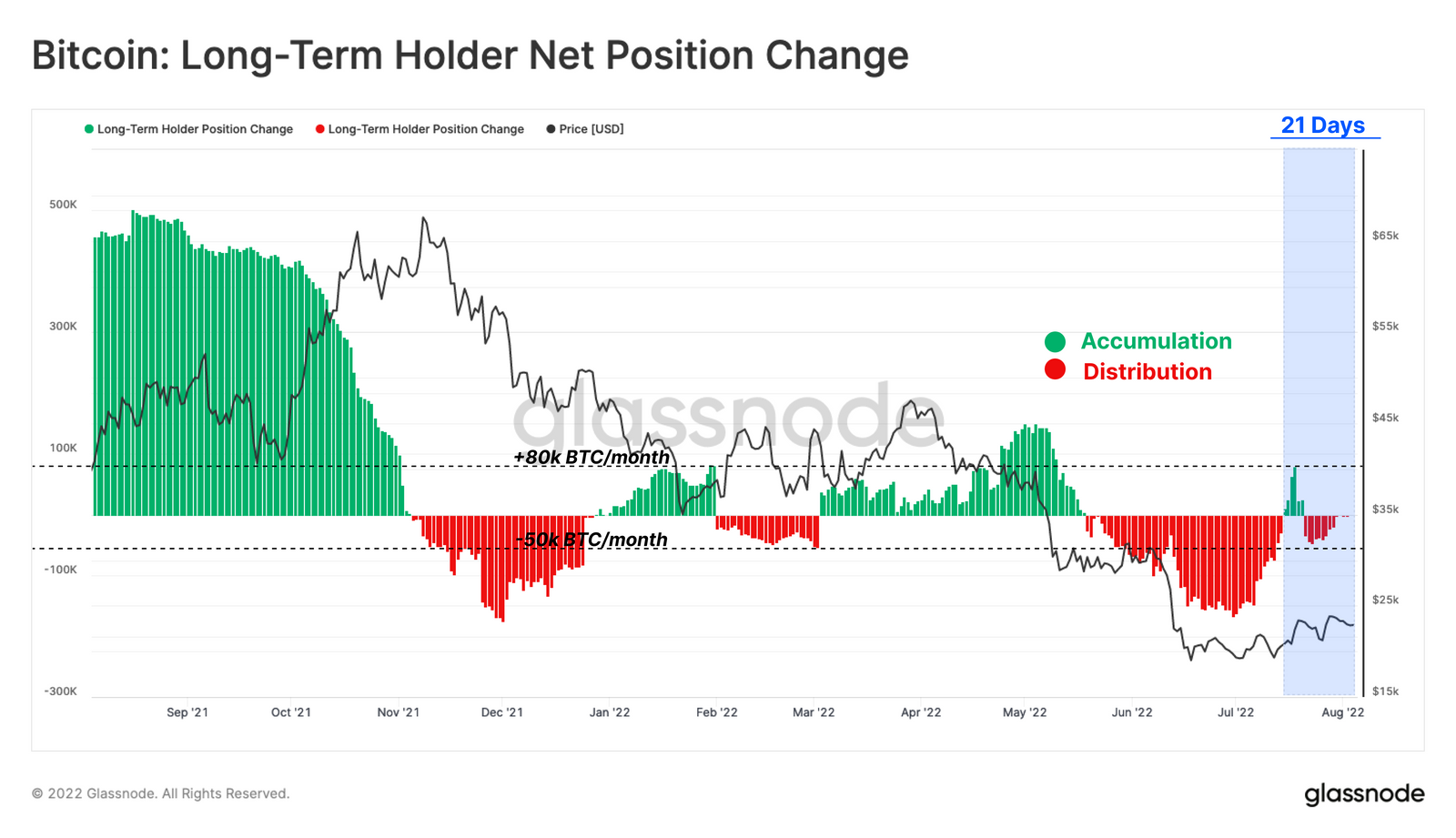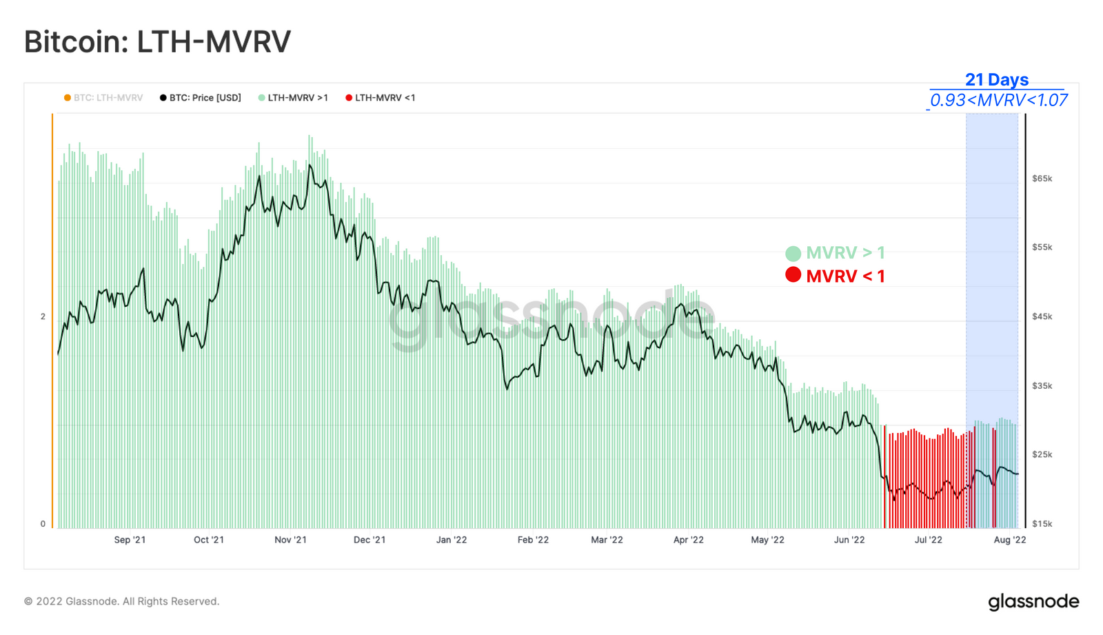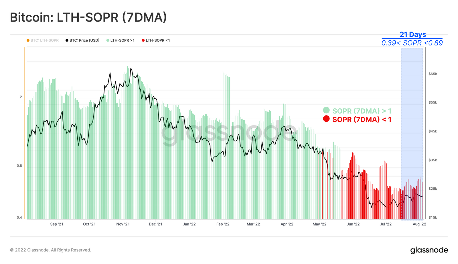 7月中旬以降、LTH-SOPRの週平均では長期保有者がコインを損失状態で売却していることを示している。価格が24kドルの水準で直近の抵抗線となった今、LTH-SOPRの週平均値は0.67となり、平均で33%の損失が実現することを示している。これは、現在の市場において長期保有者が損切りし続けていることを裏付けるものである。