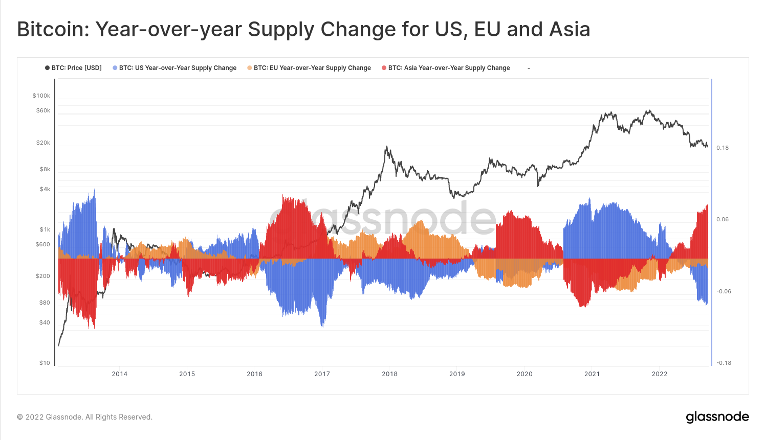 米国、EU、アジアの取引時間において、保有/取引されるビットコイン供給量のシェアにおける変化の前年比の推定値を提供する3つの新しいビットコイン指標をリリースした。ビットコイン供給のジオロケーションは、確率論を用いてエンティティレベルで行われ、エンティティの残高は、その場所であることに対して高い確実性を持つ場合にのみ、それぞれの地域の供給として示す。