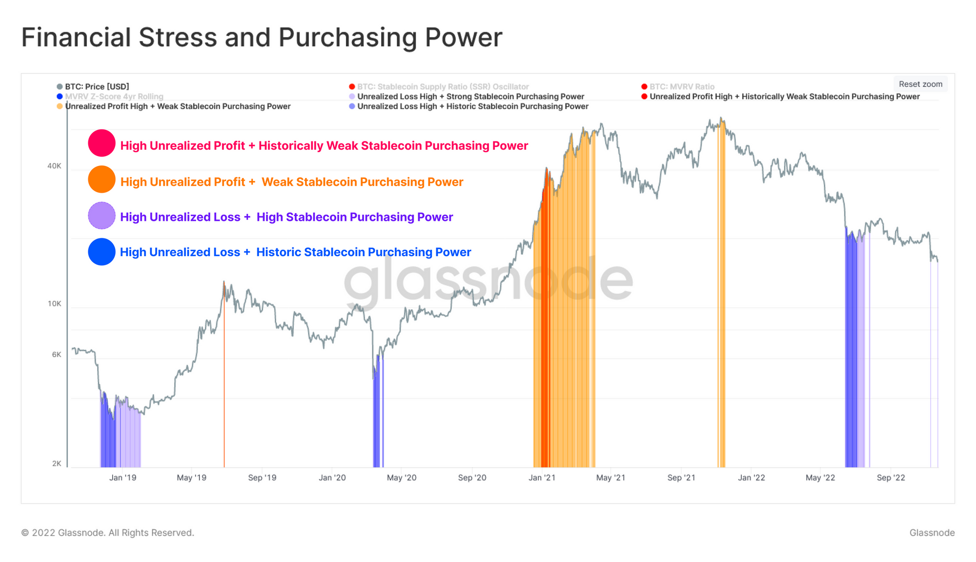 以下のチャートは、金融ストレスと購買力の関係を探ることで、トップとボトムの形成を高確率で見極めることを試みている。これは参加者が深刻な収益性ストレスを経験しているにもかかわらず、ステーブルコインの需要が増加していることを定義づけることができる。このロジックはトップ形成の場合は逆となる。