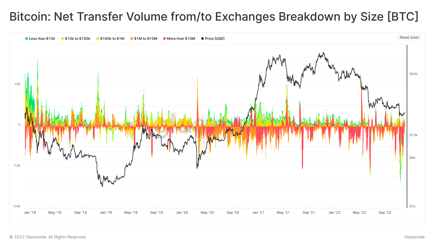 この指標は、取引所のネットフローをトランザクションサイズ別に分類したもので、トランザクションサイズは<$10kから$10M超までの範囲にある。この指標は、取引所の指標やウォレットのコホート指標と組み合わせていることで、エンティティの行動における全体像を把握するために使用できる。