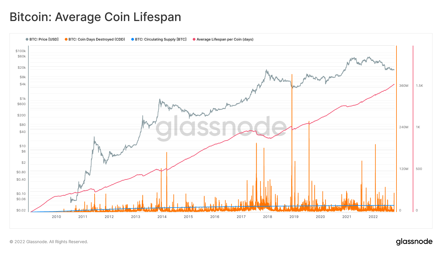 この指標は、コインごとに保持されている平均寿命(平均的な HODL 波動の年齢)を示している。これは、以下の原則に基づく。