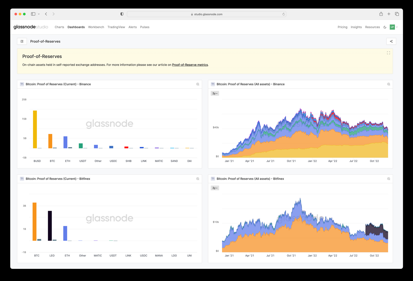 これらのプルーフ・オブ・リザーブの開示へ簡単にアクセスできるようにするため、これらの取引所の自己申告アドレスに保有されているコインやトークンの残高を監視し、グラスノードのメンバーやコミュニティのために可視化、検証を補助するツールを提供している - これらの新しい指標は、誰でも自由に利用できる。