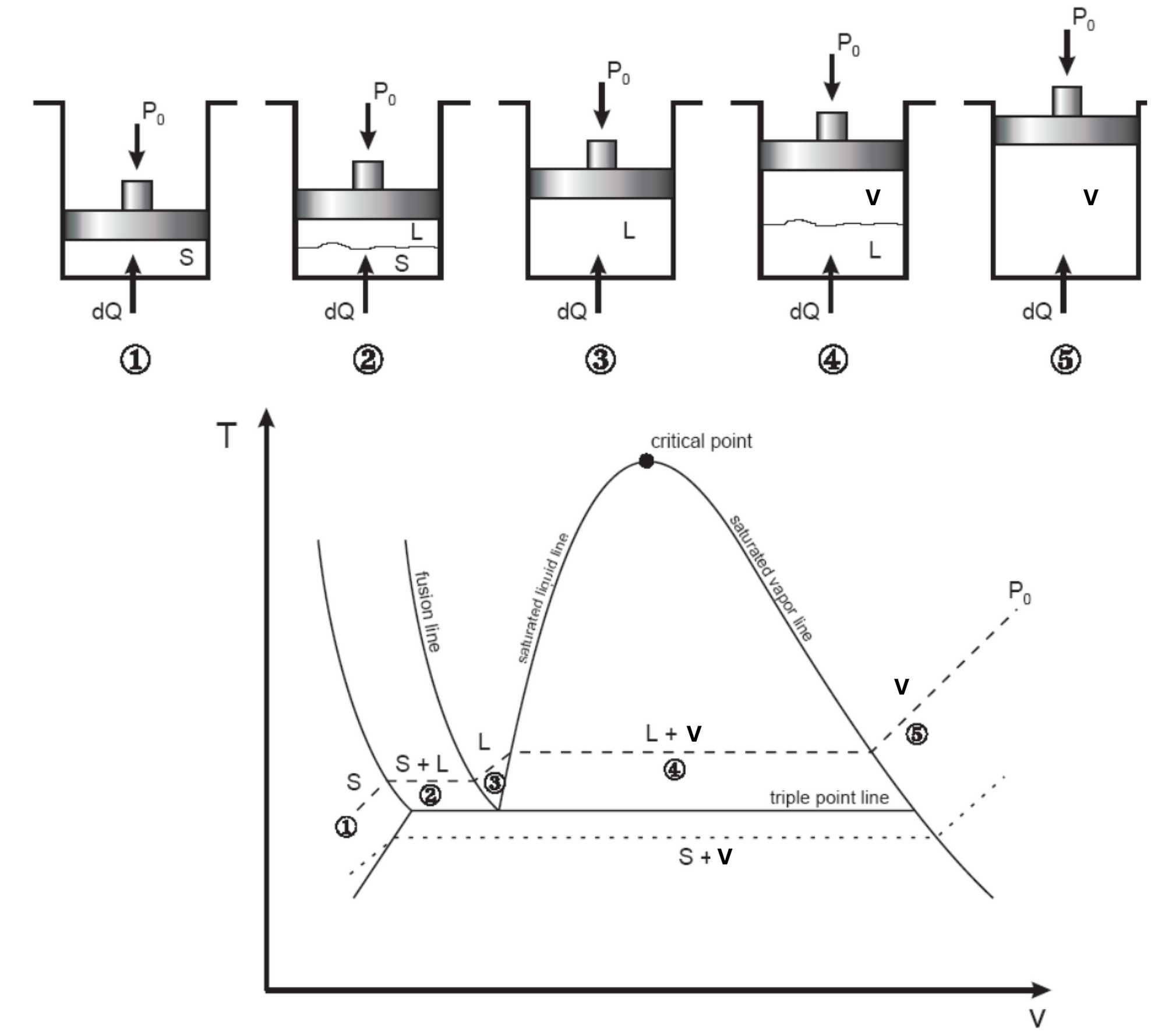 下図は、氷から始まって蒸気(VapourまたはSteam)になるまで、水を加熱する過程のステップを示したものである。