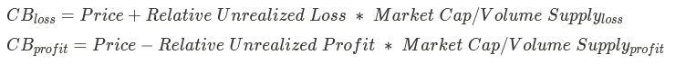 流通供給における損失と利益のあるコインの数量割合(図3)から、これらの部分のコストベーシスは以下の式で計算できる: