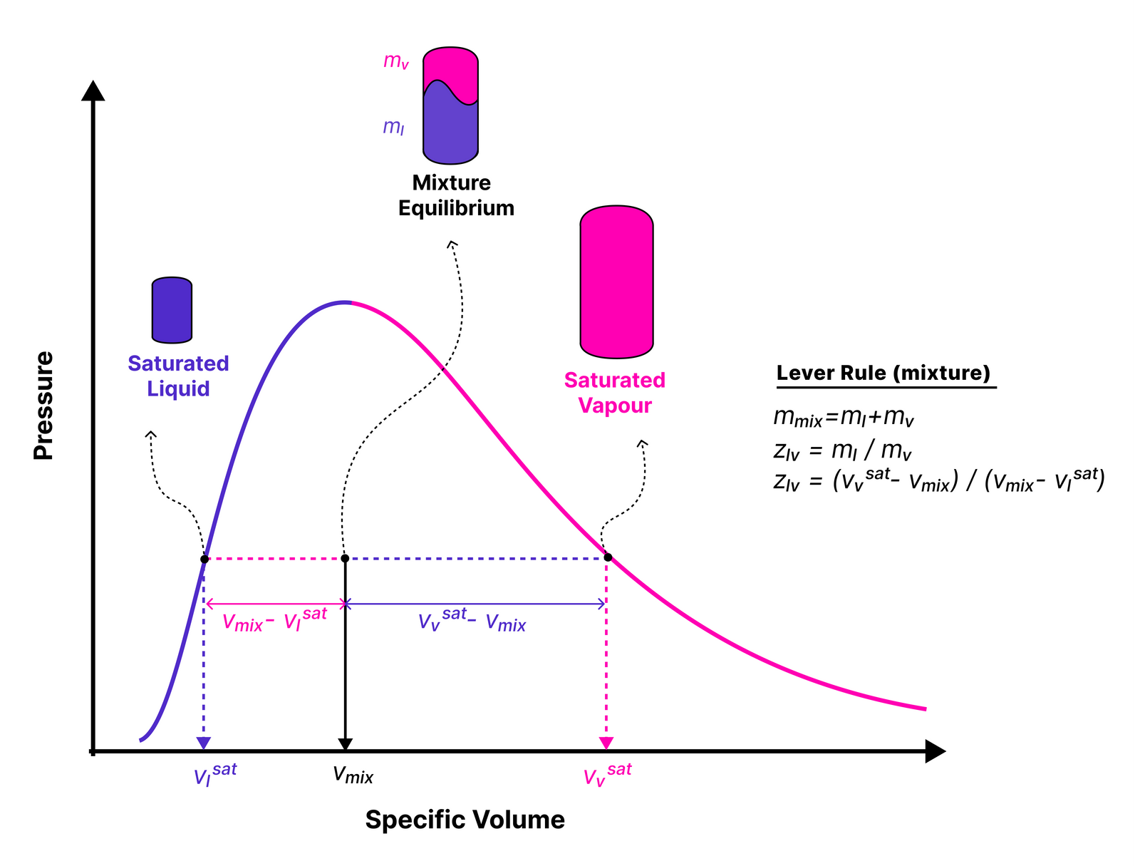 熱力学では、二相混合物の境界点に対する相対的な状態をてこの法則によって測定できる。このてこの法則に基づき、LVE段階の任意の点における液体質量と蒸気質量の比Z_lvは以下のように定式化される。