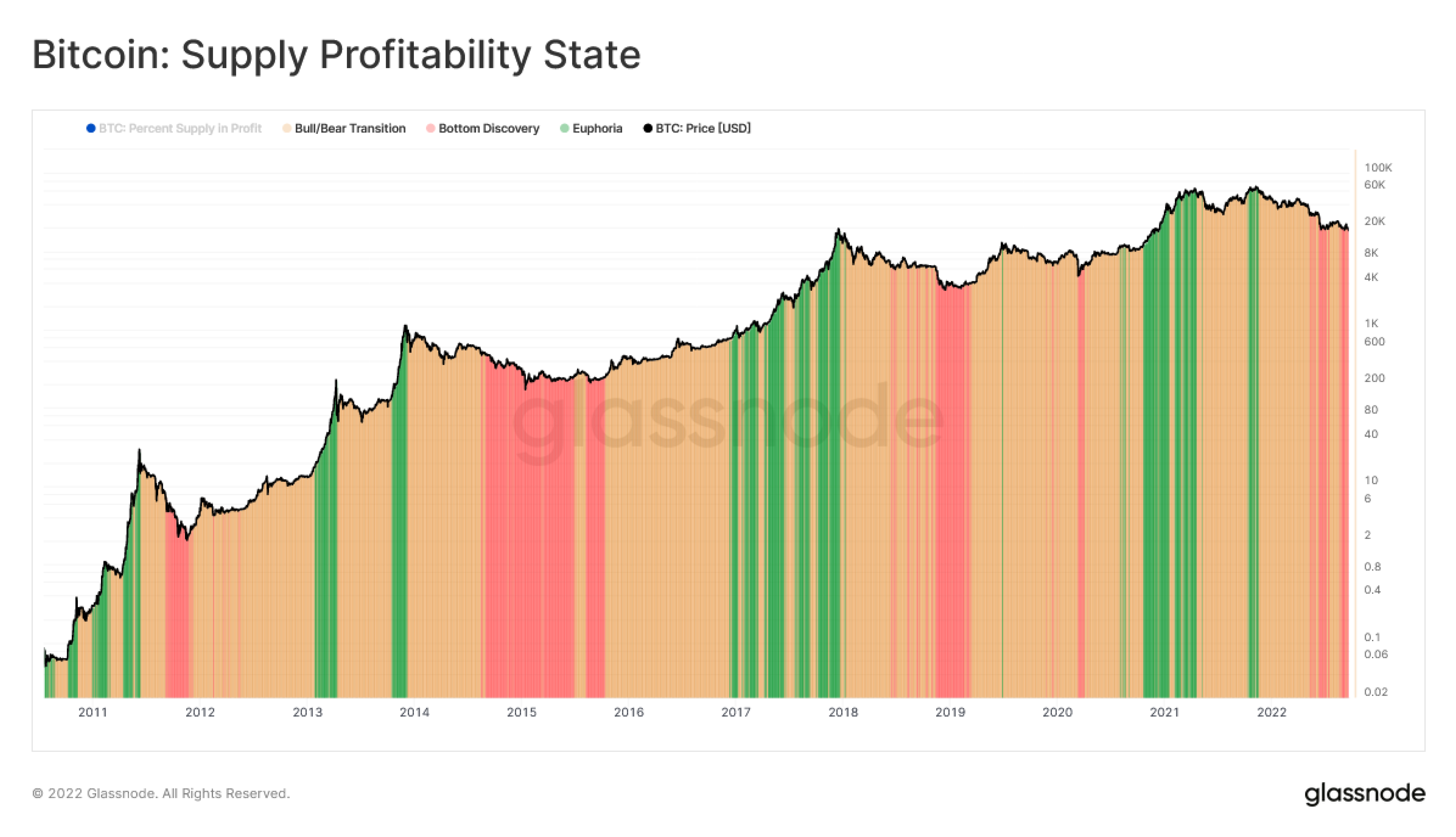 ・底値発現(損失が優勢)🟥:弱気相場の最終段階において、長期にわたる価格下落により損失のある供給の割合が支配的になる場合(利益のある供給の割合<55%)。