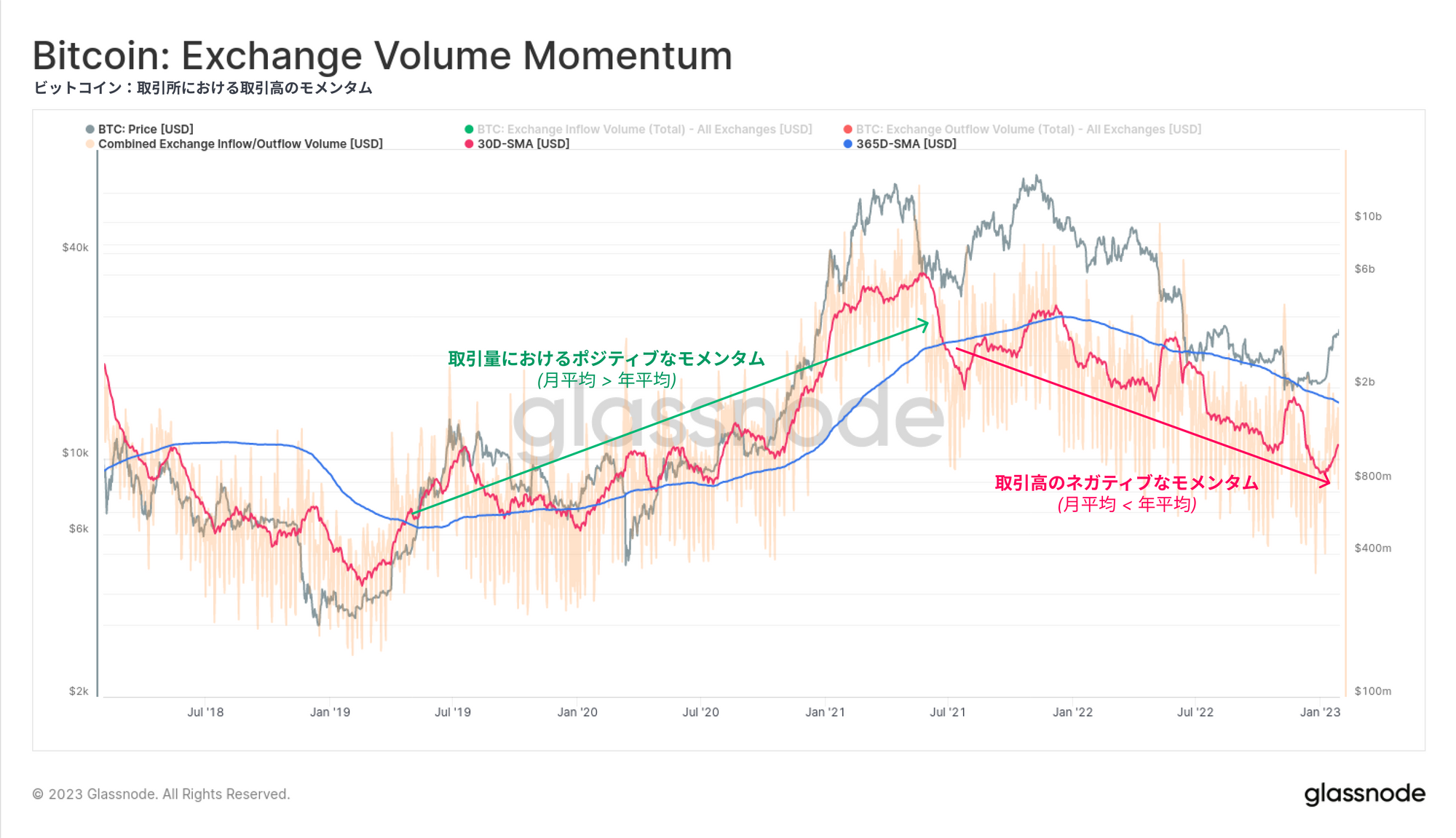 通常、市場の強さは、投資家やトレーダーがより活発になるにつれて、オンチェーン取引所の総取引量の増加を伴う。上記のような背景から、取引所送金量には依然としてネガティブなモメンタムがあることがわかる。月平均は増加し始めたが、現段階では年間ベースラインを大きく下回っている。