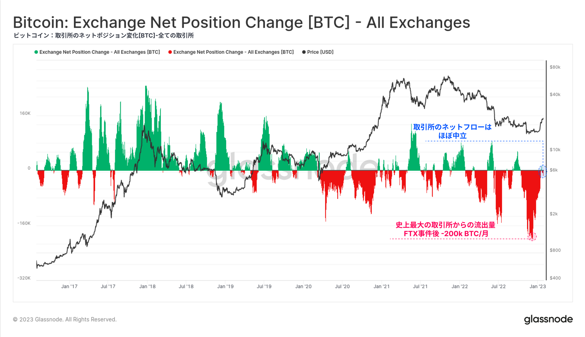 1月末に近づくにつれ、ビットコイン市場は2021年10月以来、歴史的なスポット需要と一連のショートスクイーズによって、最も強い月間価格パフォーマンスを示した。この急反騰により、市場の大部分が利益を取り戻し、先物市場は健全なコンタンゴ状態で取引された。また、FTXの後に発生した取引所からの資金流出も中立に落ち着き、現在は新たな資金流入によって均衡が保たれていることにも注目したい。